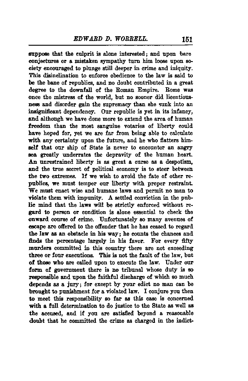 It is a mistake to suppose that the culprit is the only one interested in the outcome; and upon mere conjectures or mistaken sympathy, to turn him loose upon society, encouraged to plunge still deeper into crime and iniquity. This disinclination to enforce obedience to the law is said to be the bane of republics, and no doubt contributed in a great degree to the downfall of the Roman Empire. Rome was once the mistress of the world, but no sooner did licentiousness and disorder gain the supremacy than she sank into an insignificant dependency.