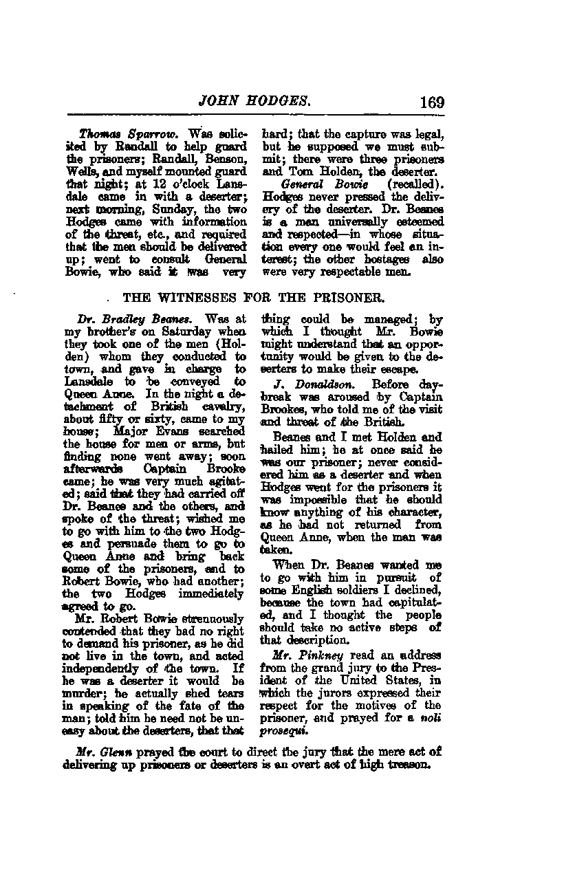 Dr. Bradley Beanes was at his brother's on Saturday when they took one of the men (Holden), whom they conducted to town and gave in charge to Lansdale to be conveyed to Queen Anne. In the night, a detachment of British cavalry, about fifty or sixty, came to his house. Major Evans searched the house for men or arms, but finding none, went away. Soon afterward, Captain Brooke came; he was very much agitated and said that they had carried off Dr. Beanes and the others, and spoke of the threat. He wished Dr. Beanes to go with him to the two Hodges and persuade them to go to Queen Anne and bring back some of the prisoners, and to Robert Bowie, who had another. The two Hodges immediately agreed to go.
