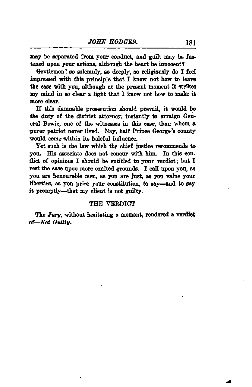 Yet such is the law which the Chief Justice recommends to you. His associate does not concur with him. In this conflict of opinions, I should be entitled to your verdict; but I rest the case upon more exalted grounds. I call upon you, as you are honorable men, as you are just, as you value your liberties, as you prize your constitution, to say—and to say it promptly—that my client is not guilty.
