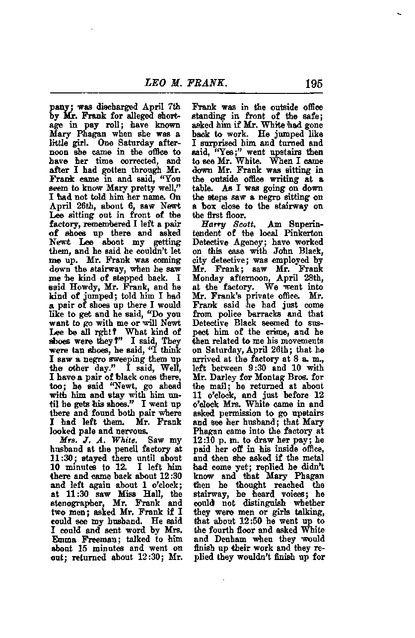 Harry Scott, the Superintendent of the local Pinkerton Detective Agency, had worked on this case with John Black, a city detective, and was employed by Mr. Frank. He saw Mr. Frank on Monday afternoon, April 28th, at the factory. They went into Mr. Frank's private office, where Mr. Frank mentioned he had just come from the police barracks and that Detective Black seemed to suspect him of the crime. He then detailed his movements on Saturday, April 26th: he arrived at the factory at 8 AM, left between 9:30 and 10 AM with Mr. Darley for Montag Bros. to collect the mail, and returned around 11 AM. Just before 12 PM, Mrs. White came in and asked permission to go upstairs to see her husband. Mary Phagan entered the factory at 12:10 PM to draw her pay, and he paid her off in his inside office. She then asked if the metal had arrived, to which he replied he didn't know. He thought Mary Phagan then reached the stairway, and he heard voices but couldn't distinguish whether they were men or girls talking. Around 12:50 PM, he went up to the fourth floor and asked White and Denham when they would finish their work, and they replied they wouldn't finish up for a while.