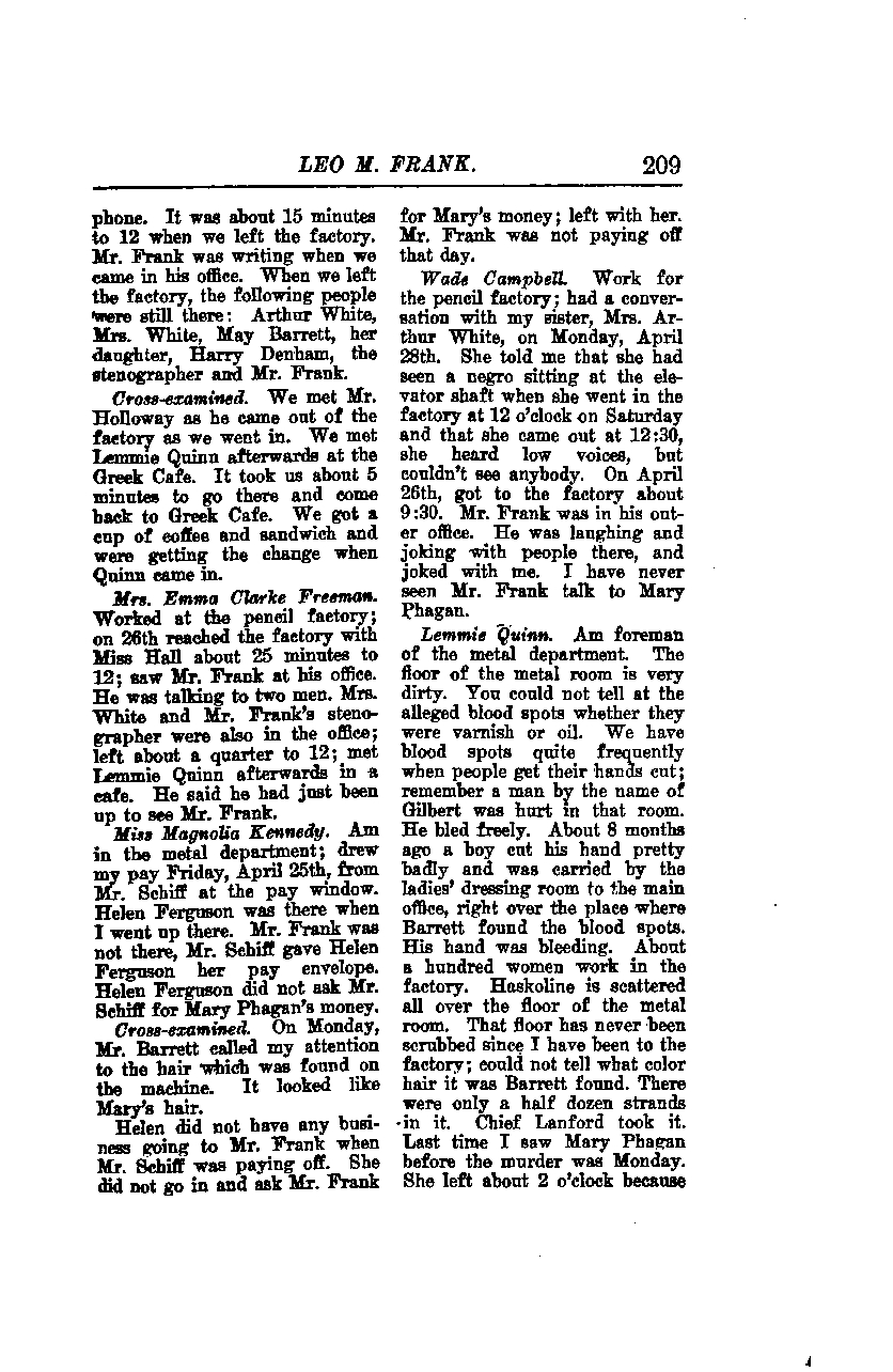 I am the foreman of the metal department. The floor of the metal room is very dirty. You could not tell at the alleged blood spots whether they were varnish or oil. We have blood spots quite frequently when people get their hands cut; I remember a man by the name of Gilbert was hurt in that room. He bled freely. About 8 months ago, a boy cut his hand pretty badly and was carried by the ladies’ dressing room to the main office, right over the place where Barrett found the blood spots. His hand was bleeding. About a hundred women work in the factory. Haskoline is scattered all over the floor of the metal room. That floor has never been scrubbed since I have been at the factory; I could not tell what color hair it was that Barrett found. There were only a half dozen strands in it. Chief Lanford took it. The last time I saw Mary Phagan before the murder was on Monday. She left about 2 o'clock because...