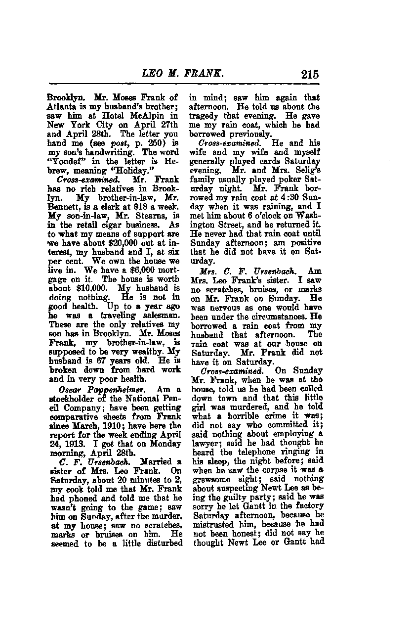 Brooklyn, Mr. Moses Frank of Atlanta is my husband's brother; I saw him at Hotel McAlpin in New York City on April 27th and April 28th. The letter you handed me (see post, p. 250) is in my son's handwriting. The word "Yondef" in the letter is Hebrew, meaning "Holiday."