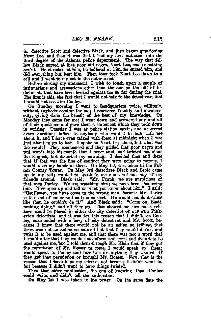 On May 1st, I was taken to the Fulton County Tower. On May 3rd, detectives Black and Scott came up to my cell and wanted to speak to me alone without any of my friends around. Black said, "Mr. Frank, we are suspicious of that man Darley. We are watching him; we have been shadowing him. Now open up and tell us what you know about him." I said, "Gentlemen, you have come to the wrong man, because Mr. Darley is the soul of honor and as true as steel. He would not do a crime like that; he couldn’t do it." And Black said, "Come on, Scott, nothing doing," and off they went. That showed me how much reliance could be placed in either the city detective or our own Pinkerton detectives, and it was for this reason that I didn’t see Conley, surrounded with a bevy of city detectives and Mr. Scott, because I knew that there would not be an action so trifling, that there was not an action so natural but that they would distort and twist it to be used against me, and that there was not a word that I could utter that they would not deform and twist and distort to be used against me. But I told them through Mr. Klein that if they got the permission of Mr. Rosser to come, I would speak to them, would speak to Conley and face him or anything they wanted—if they got that permission or brought Mr. Rosser. Now, that is the reason that I have kept my silence, not because I didn’t want to, but because I didn’t want to have things twisted.