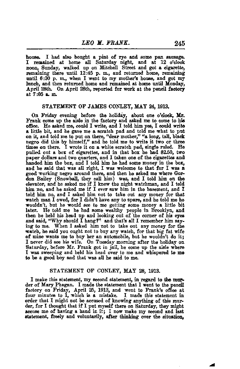 I make this statement, my second statement, in regard to the murder of Mary Phagan. I made the statement that I went to the pencil factory on Friday, April 25, 1913, and went to Frank's office at four minutes to 1, which is a mistake. I made this statement in order that I might not be accused of knowing anything of this murder, for I thought that if I put myself there on Saturday, they might accuse me of having a hand in it. I now make my second and last statement, freely and voluntarily, after thinking over the situation.