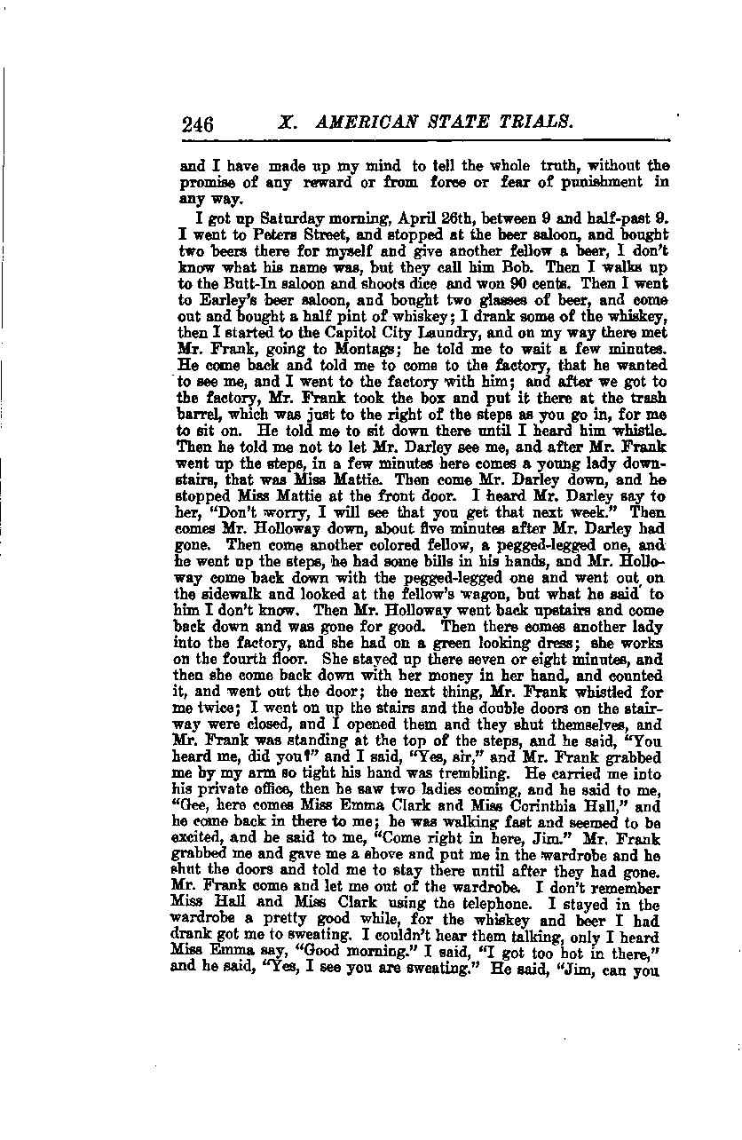 Then another lady came into the factory; she had on a green-looking dress and worked on the fourth floor. She stayed up there seven or eight minutes, then came back down with her money in her hand, counted it, and went out the door. The next thing, Mr. Frank whistled for me twice. I went up the stairs, and the double doors on the stairway were closed. I opened them, and they shut themselves. Mr. Frank was standing at the top of the steps, and he said, "You heard me, did you?" and I said, "Yes, sir." Mr. Frank grabbed me by my arm so tight that his hand was trembling. He carried me into his private office, then he saw two ladies coming, and he said to me, "Gee, here comes Miss Emma Clark and Miss Corinthia Hall." He came back in there to me; he was walking fast and seemed to be excited, and he said to me, "Come right in here, Jim." Mr. Frank grabbed me and gave me a shove and put me in the wardrobe, and he shut the doors and told me to stay there until after they had gone. Mr. Frank came and let me out of the wardrobe. I don't remember Miss Hall and Miss Clark using the telephone. I stayed in the wardrobe a pretty good while, for the whiskey and beer I had drunk got me to sweating. I couldn’t hear them talking, only I heard Miss Emma say, "Good morning." I said, "I got too hot in there," and he said, "Yes, I see you are sweating." He said, "Jim, can you..."