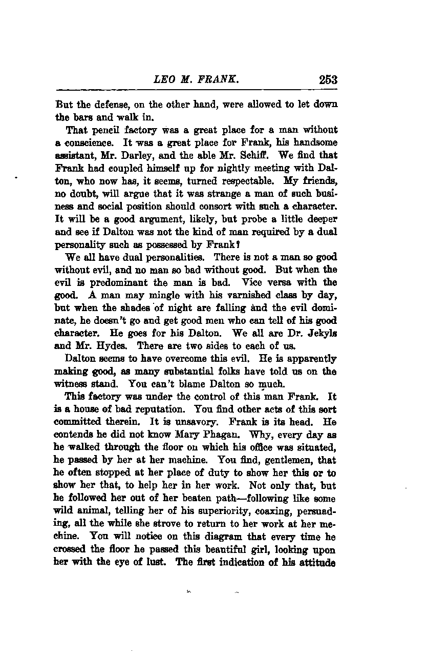 That pencil factory was a great place for a man without a conscience. It was a great place for Frank, his handsome assistant, Mr. Darley, and the able Mr. Schiff. We find that Frank had coupled himself up for nightly meetings with Dalton, who now has, it seems, turned respectable. My friends, no doubt, will argue that it was strange a man of such business and social position should consort with such a character. It will be a good argument, likely, but probe a little deeper and see if Dalton was not the kind of man required by a dual personality such as possessed by Frank?