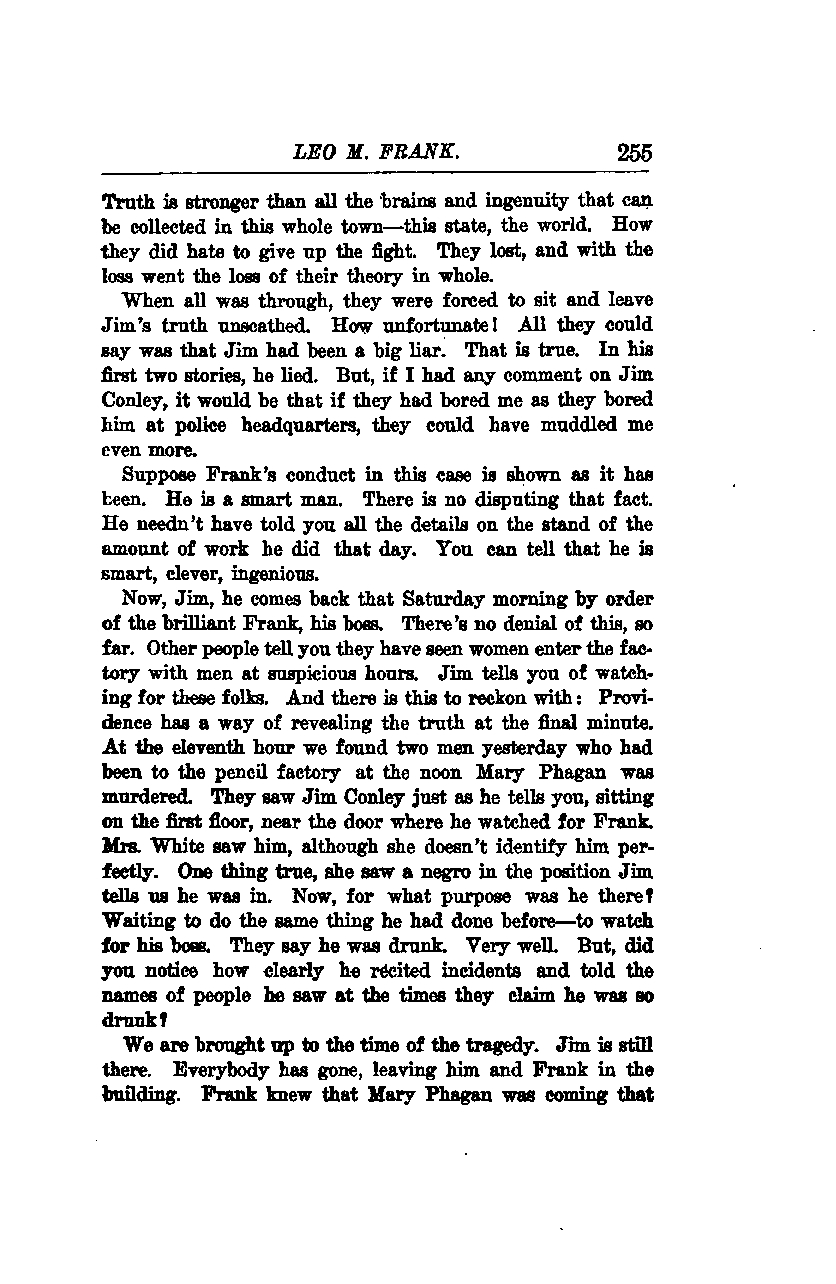 Now, Jim, he comes back that Saturday morning by order of the brilliant Frank, his boss. There's no denial of this, so far. Other people tell you they have seen women enter the factory with men at suspicious hours. Jim tells you of watching for these folks. And there is this to reckon with: Providence has a way of revealing the truth at the final minute. At the eleventh hour, we found two men yesterday who had been to the pencil factory at the noon Mary Phagan was murdered. They saw Jim Conley just as he tells you, sitting on the first floor, near the door where he watched for Frank. Mrs. White saw him, although she doesn't identify him perfectly. One thing is true, she saw a negro in the position Jim tells us he was in. Now, for what purpose was he there? Waiting to do the same thing he had done before—to watch for his boss. They say he was drunk. Very well. But, did you notice how clearly he recited incidents and told the names of people he saw at the times they claim he was so drunk?