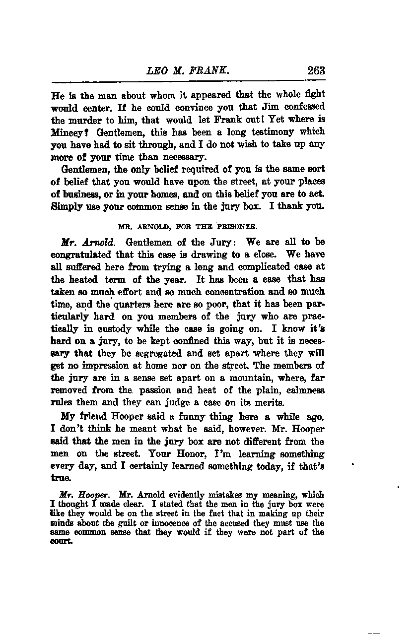 He is the man about whom it appeared that the whole fight would center. If he could convince you that Jim confessed the murder to him, that would let Frank out! Yet where is Mincey? Gentlemen, this has been a long testimony which you have had to sit through, and I do not wish to take up any more of your time than necessary.