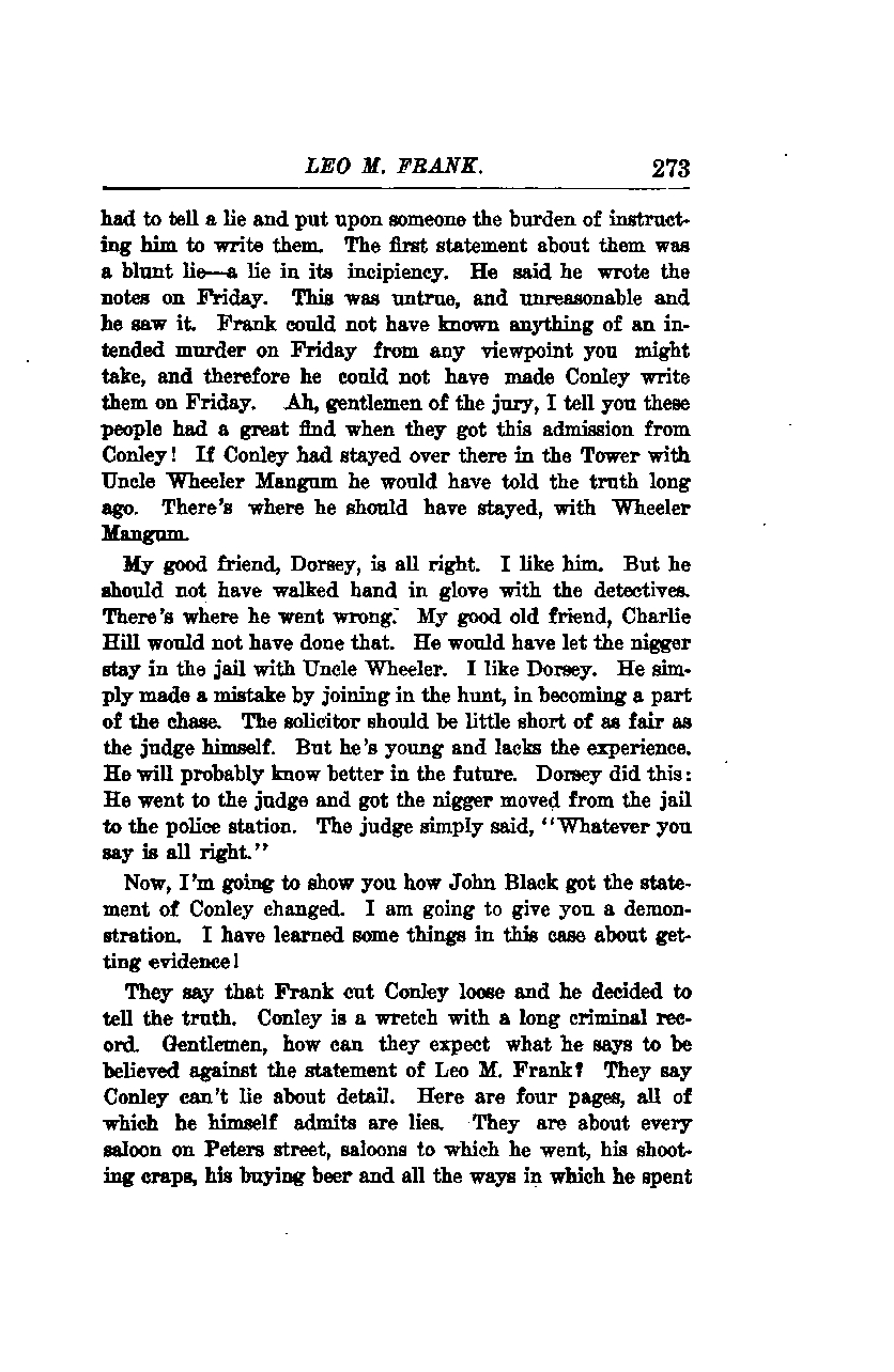 They say that Frank cut Conley loose and he decided to tell the truth. Conley is a wretch with a long criminal record. Gentlemen, how can they expect what he says to be believed against the statement of Leo M. Frank? They say Conley can't lie about detail. Here are four pages, all of which he himself admits are lies. They are about every saloon on Peters Street, saloons to which he went, his shooting craps, his buying beer, and all the ways in which he spent his time.