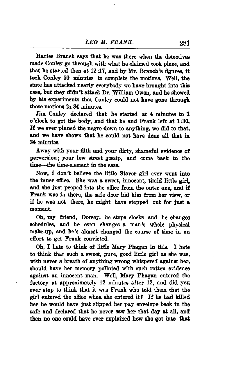 Oh, I hate to think of little Mary Phagan in this. I hate to think that such a sweet, pure, good little girl as she was, with never a breath of anything wrong whispered against her, should have her memory polluted with such rotten evidence against an innocent man. Mary Phagan entered the factory at approximately 12 minutes after 12. Did you ever stop to think that it was Frank who told them that the girl entered the office when she did? If he had killed her, he would have just slipped her pay envelope back in the safe and declared that he never saw her that day at all, and then no one could have ever explained how she got into that...