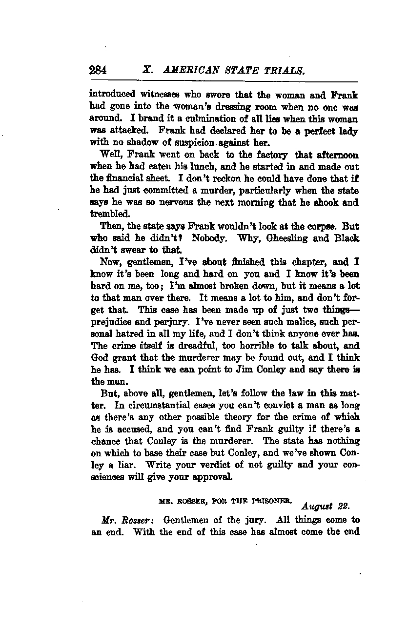Now, gentlemen, I’ve about finished this chapter, and I know it’s been long and hard on you, and I know it’s been hard on me, too; I’m almost broken down, but it means a lot to that man over there. It means a lot to him, and don’t forget that. This case has been made up of just two things—prejudice and perjury. I’ve never seen such malice, such personal hatred in all my life, and I don’t think anyone ever has. The crime itself is dreadful, too horrible to talk about, and God grant that the murderer may be found out, and I think he has. I think we can point to Jim Conley and say there is the man.