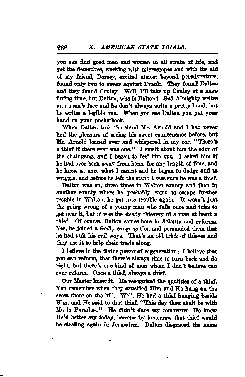 You can find good men and women in all strata of life, and yet the detectives, working with microscopes and with the aid of my friend, Dorsey, excited almost beyond peradventure, found only two to swear against Frank. They found Dalton and they found Conley. Well, I'll take up Conley at a more fitting time, but Dalton, who is Dalton? God Almighty writes on a man's face, and he doesn't always write a pretty hand, but he writes a legible one. When you see Dalton, you put your hand on your pocketbook.