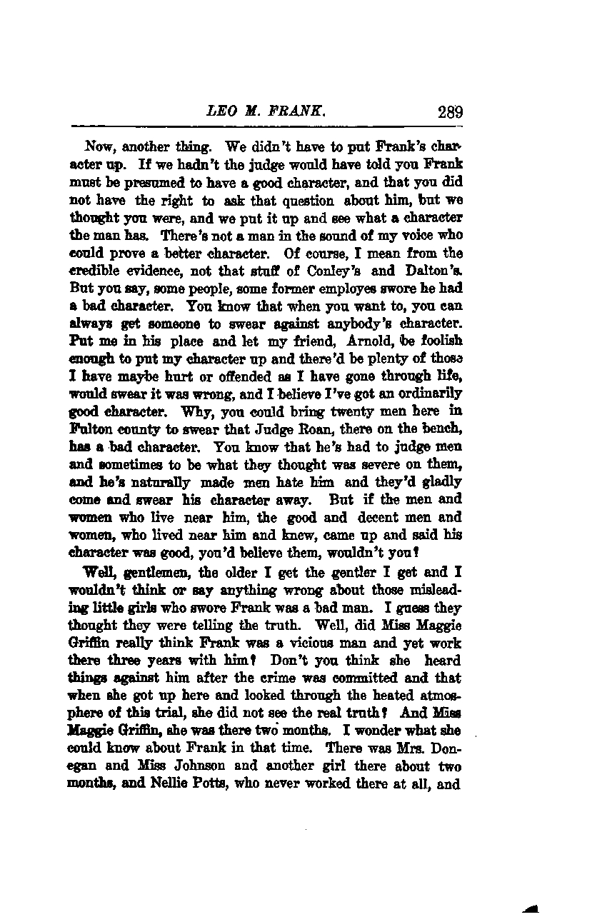 Well, gentlemen, the older I get, the gentler I get, and I wouldn't think or say anything wrong about those misleading little girls who swore Frank was a bad man. I guess they thought they were telling the truth. Well, did Miss Maggie Griffin really think Frank was a vicious man and yet work there three years with him? Don't you think she heard things against him after the crime was committed and that when she got up here and looked through the heated atmosphere of this trial, she did not see the real truth? And Miss Maggie Griffin, she was there two months; I wonder what she could know about Frank in that time. There was Mrs. Donegan and Miss Johnson and another girl there about two months, and Nellie Potts, who never worked there at all.