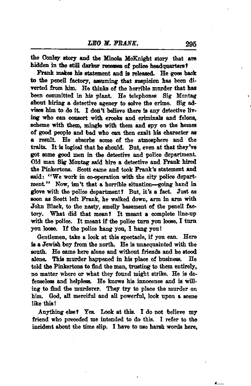 Gentlemen, take a look at this spectacle, if you can. Here is a Jewish boy from the north. He is unacquainted with the south. He came here alone and without friends, and he stood alone. This murder happened in his place of business. He told the Pinkertons to find the man, trusting them entirely, no matter where or what they found might strike. He is defenseless and helpless. He knows his innocence and is willing to find the murderer. They try to place the murder on him. God, all merciful and all powerful, look upon a scene like this!