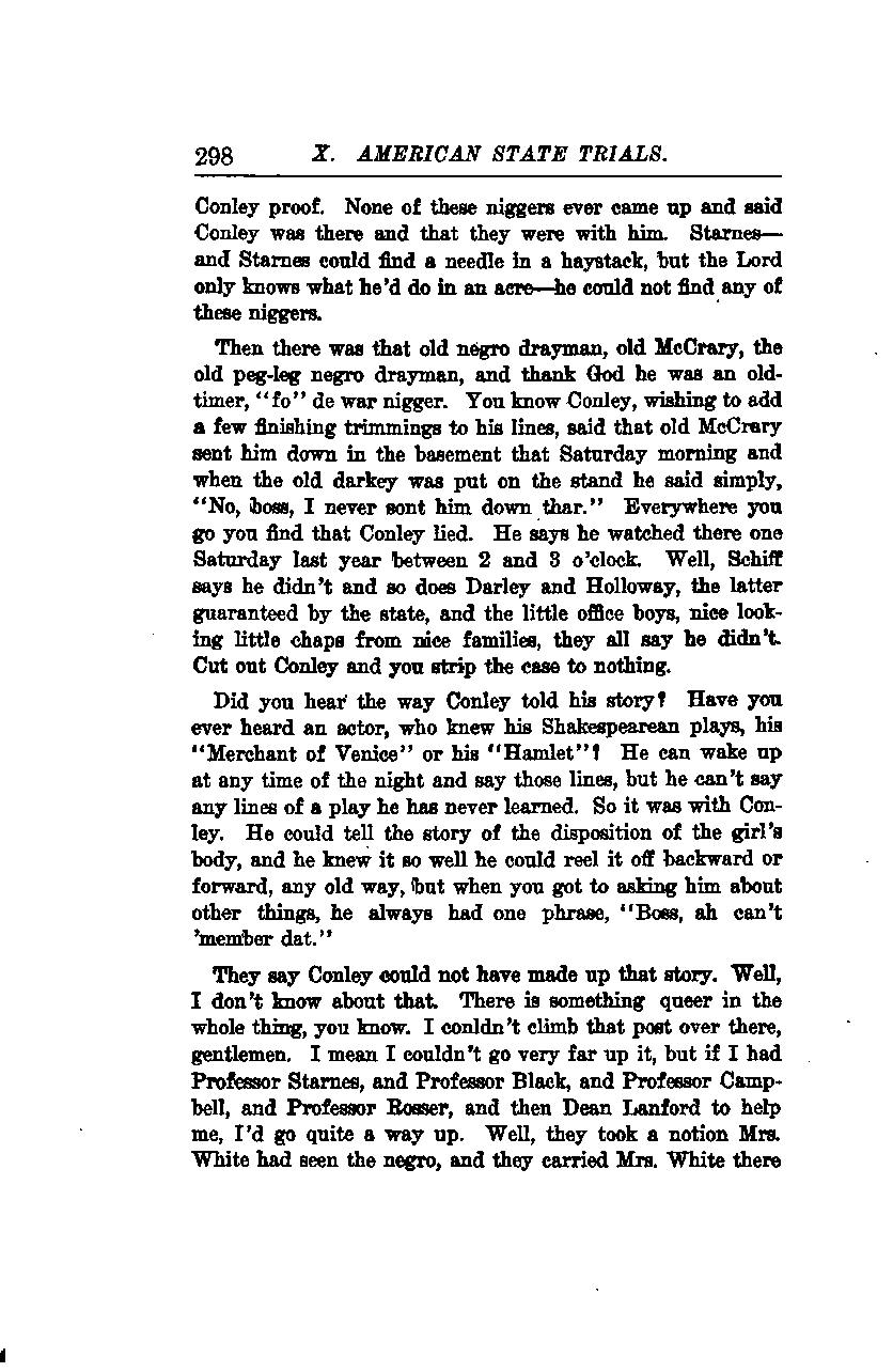 Then there was that old negro drayman, old McCrary, the old peg-leg negro drayman, and thank God he was an old-timer, a "fo' de war" nigger. You know Conley, wishing to add a few finishing trimmings to his lines, said that old McCrary sent him down to the basement that Saturday morning. When the old darkey was put on the stand, he said simply, "No, bossa, I never sont him down thar." Everywhere you go, you find that Conley lied. He says he watched there one Saturday last year between 2 and 3 o'clock. Well, Schiff says he didn’t, and so do Darley and Holloway, the latter guaranteed by the state, and the little office boys, nice-looking little chaps from nice families, they all say he didn’t. Cut out Conley, and you strip the case to nothing.
