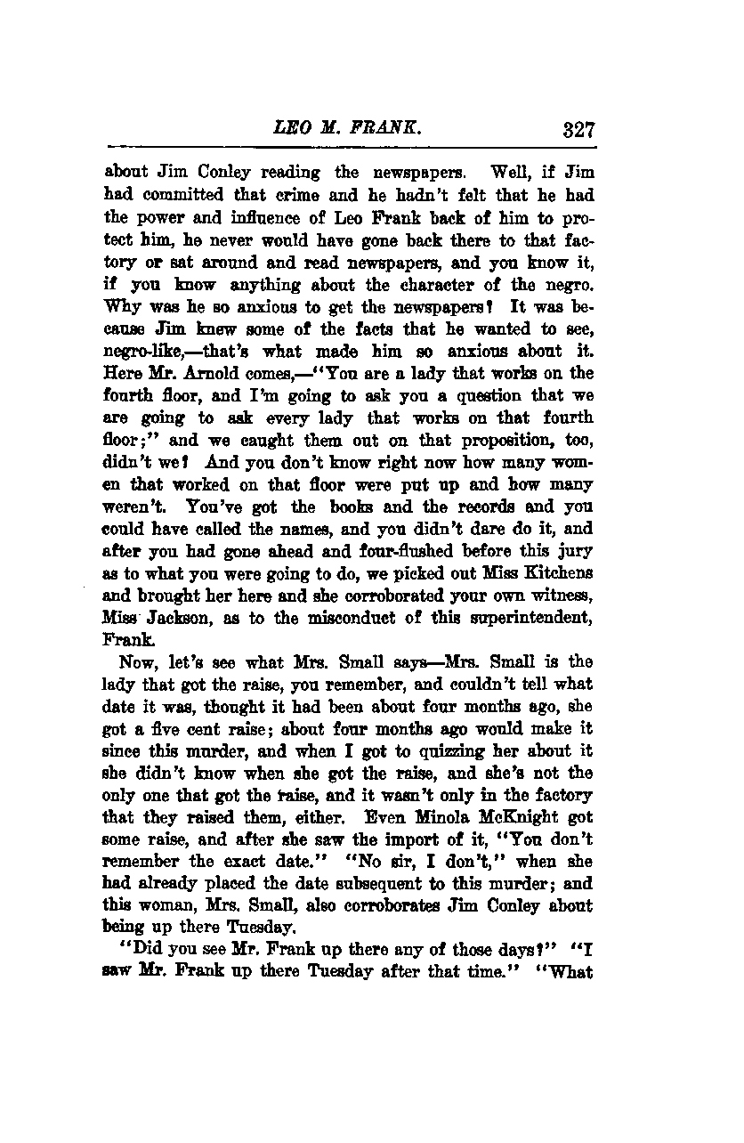 Now, let's see what Mrs. Small says. Mrs. Small is the lady that got the raise, you remember, and couldn't tell what date it was. She thought it had been about four months ago, she got a five-cent raise; about four months ago would make it since this murder. When I got to quizzing her about it, she didn't know when she got the raise, and she's not the only one that got the raise. It wasn't only in the factory that they raised them, either. Even Minola McKnight got some raise, and after she saw the import of it, "You don't remember the exact date." "No sir, I don't," when she had already placed the date subsequent to this murder. This woman, Mrs. Small, also corroborates Jim Conley about being up there Tuesday.