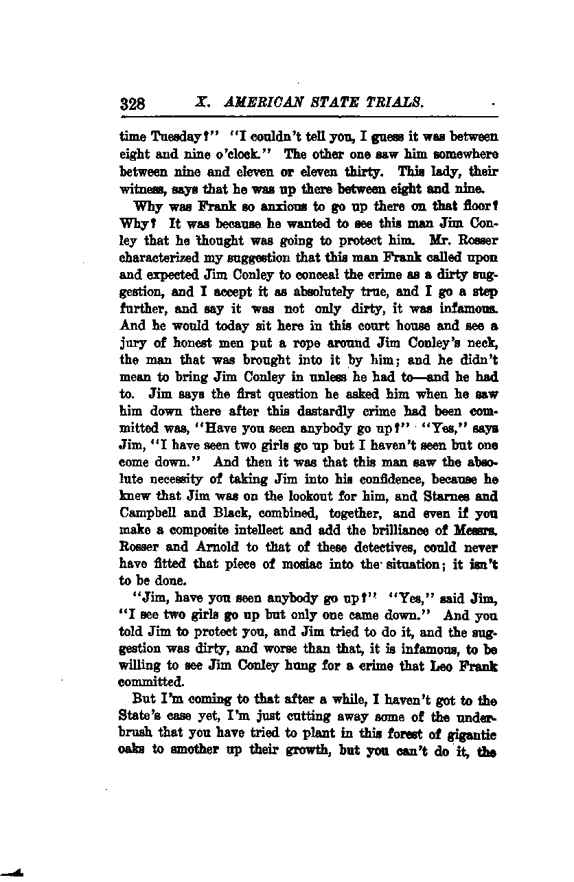 Why was Frank so anxious to go up there on that floor? Why? It was because he wanted to see this man, Jim Conley, that he thought was going to protect him. Mr. Rosser characterized my suggestion that this man Frank called upon and expected Jim Conley to conceal the crime as a dirty suggestion, and I accept it as absolutely true, and I go a step further, and say it was not only dirty, it was infamous. And he would today sit here in this courthouse and see a jury of honest men put a rope around Jim Conley's neck, the man that was brought into it by him; and he didn't mean to bring Jim Conley in unless he had to—and he had to. Jim says the first question he asked him when he saw him down there after this dastardly crime had been committed was, "Have you seen anybody go up?" "Yes," says Jim, "I have seen two girls go up but I haven't seen but one come down." And then it was that this man saw the absolute necessity of taking Jim into his confidence, because he knew that Jim was on the lookout for him, and Starnes and Campbell and Black, combined together, and even if you make a composite intellect and add the brilliance of Messrs. Rosser and Arnold to that of these detectives, could never have fitted that piece of mosaic into the situation; it isn't to be done.
