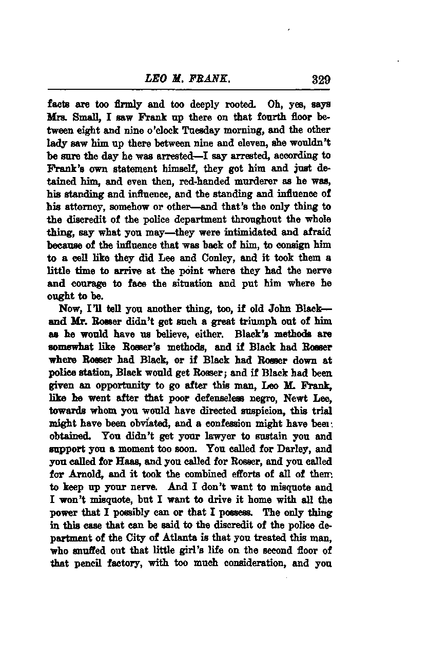 Now, I'll tell you another thing, too. If old John Black—and Mr. Rosser didn't get such a great triumph out of him as he would have us believe, either. Black's methods are somewhat like Rosser's methods, and if Black had Rosser where Rosser had Black, or if Black had Rosser down at the police station, Black would get Rosser. If Black had been given an opportunity to go after this man, Leo M. Frank, like he went after that poor defenseless negro, Newt Lee, towards whom you would have directed suspicion, this trial might have been obviated, and a confession might have been obtained. You didn't get your lawyer to sustain you and support you a moment too soon. You called for Darley, and you called for Haas, and you called for Rosser, and you called for Arnold, and it took the combined efforts of all of them to keep up your nerve. And I don't want to misquote and I won't misquote, but I want to drive it home with all the power that I possibly can or that I possess. The only thing in this case that can be said to the discredit of the police department of the City of Atlanta is that you treated this man, who snuffed out that little girl's life on the second floor of that pencil factory, with too much consideration.