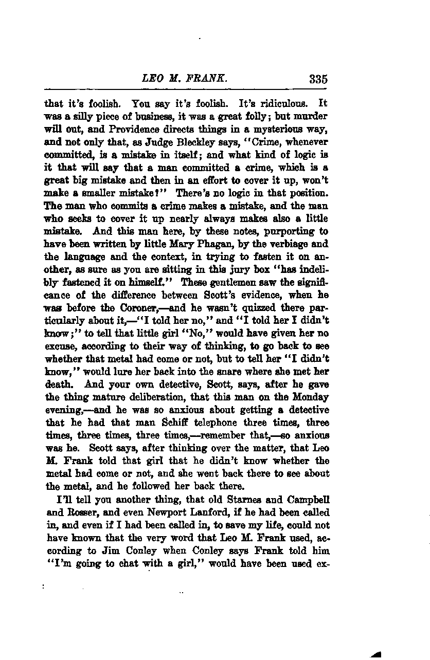 I'll tell you another thing: that old Starnes and Campbell and Rosser, and even Newport Lanford, if he had been called in, and even if I had been called in, to save my life, could not have known that the very word that Leo M. Frank used, according to Jim Conley when Conley says Frank told him, "I'm going to chat with a girl," would have been used exactly.