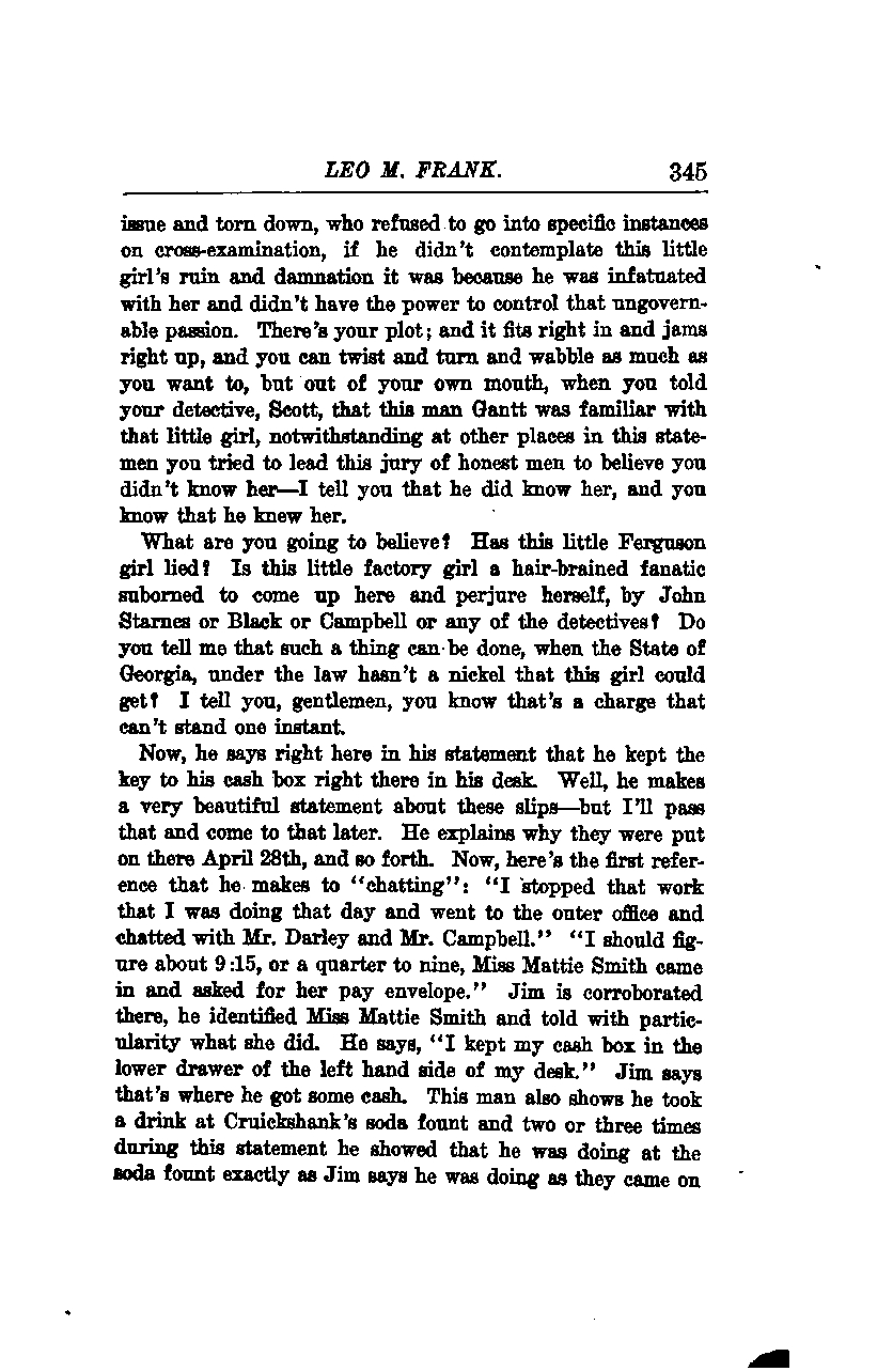 What are you going to believe? Has this little Ferguson girl lied? Is this little factory girl a hair-brained fanatic suborned to come up here and perjure herself, by John Starnes or Black or Campbell or any of the detectives? Do you tell me that such a thing can be done, when the State of Georgia, under the law, hasn't a nickel that this girl could get? I tell you, gentlemen, you know that's a charge that can't stand one instant.