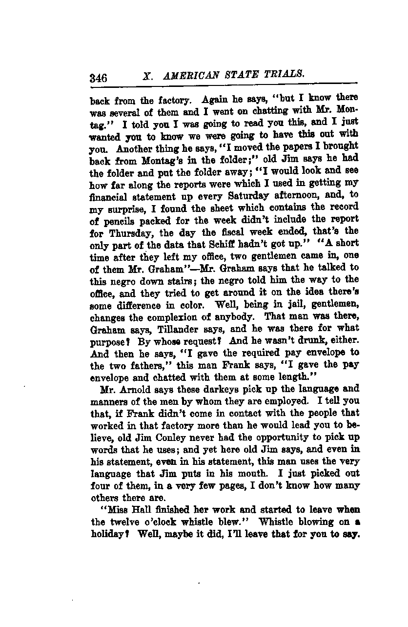 Mr. Arnold says these darkeys pick up the language and manners of the men by whom they are employed. I tell you that if Frank didn't come in contact with the people that worked in that factory more than he would lead you to believe, old Jim Conley never had the opportunity to pick up words that he uses. And yet, here old Jim says, and even in his statement, even in his statement, this man uses the very language that Jim puts in his mouth. I just picked out four of them in a very few pages; I don't know how many others there are.
