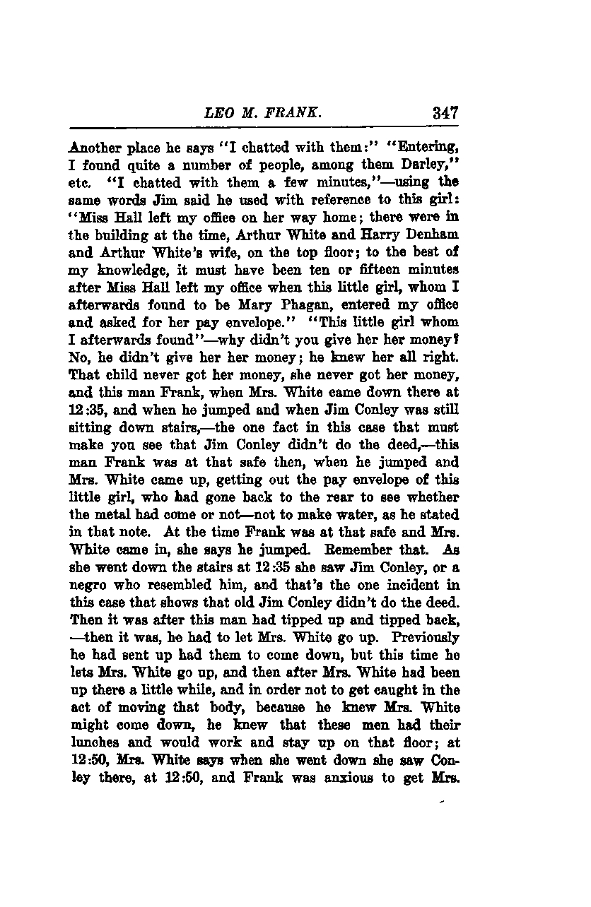 At the time Frank was at that safe and Mrs. White came in, she says he jumped. Remember that. As she went down the stairs at 12:35, she saw Jim Conley, or a negro who resembled him, and that's the one incident in this case that shows that old Jim Conley didn't do the deed. Then it was after this man had tipped up and tipped back,—then it was, he had to let Mrs. White go up. Previously, he had sent up and had them come down, but this time he lets Mrs. White go up, and then after Mrs. White had been up there a little while, and in order not to get caught in the act of moving that body, because he knew Mrs. White might come down, he knew that these men had their lunches and would work and stay up on that floor; at 12:50, Mrs. White says when she went down she saw Conley there, at 12:50, and Frank was anxious to get Mrs. White out of the building.
