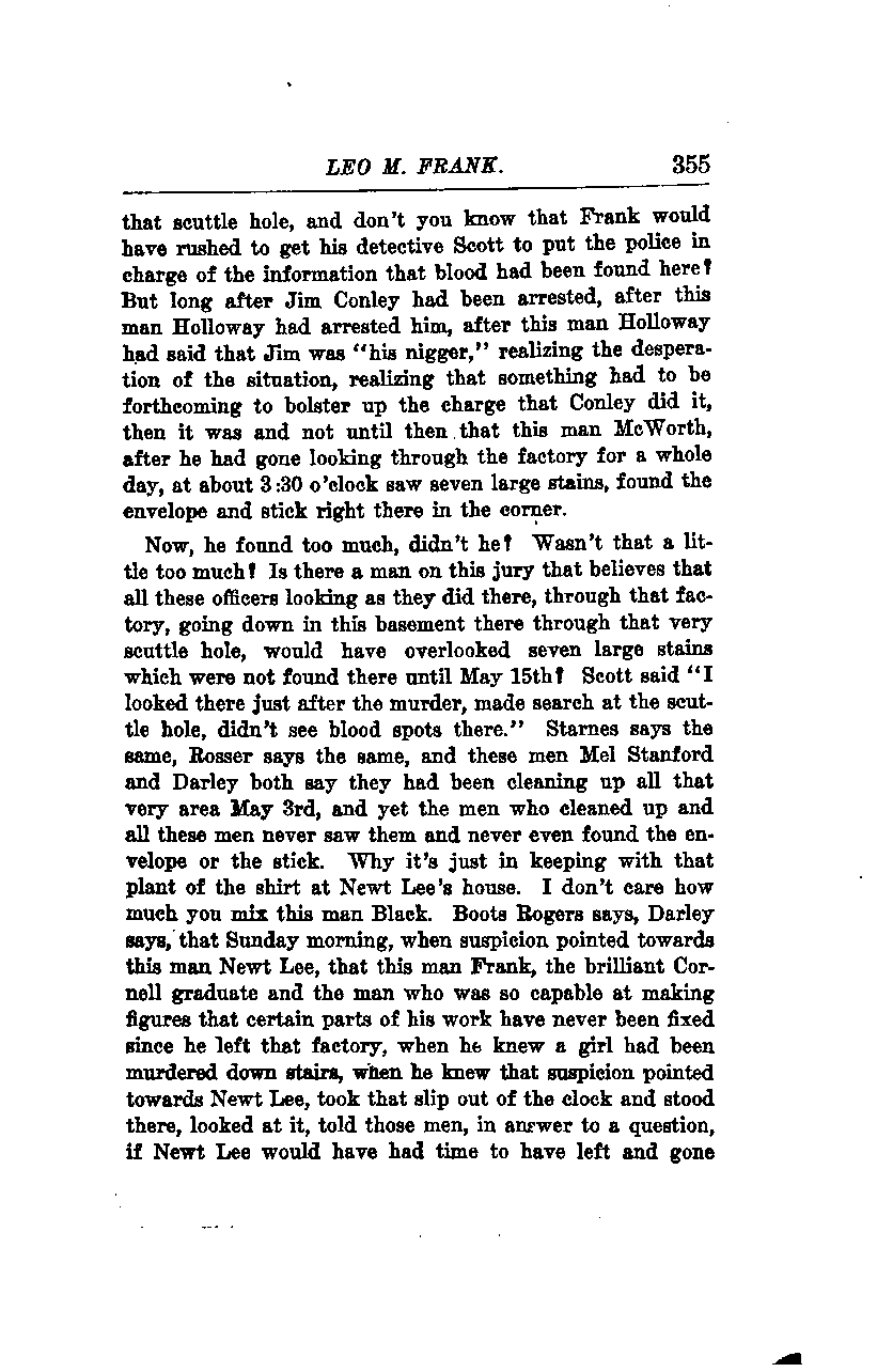 Consider that scuttle hole. Don't you know that Frank would have rushed to get his detective, Scott, to put the police in charge of the information that blood had been found there? But long after Jim Conley had been arrested, after this man Holloway had arrested him, after Holloway had said that Jim was "his nigger," realizing the desperation of the situation and that something had to be forthcoming to bolster up the charge that Conley did it, then it was—and not until then—that this man McWorth, after he had gone looking through the factory for a whole day, at about 3:30 o'clock, saw seven large stains and found the envelope and stick right there in the corner.