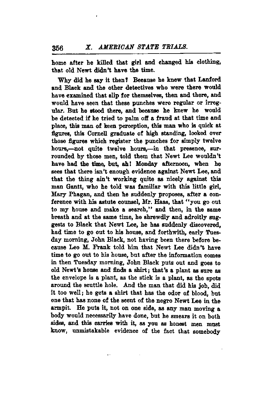 But, ah! Monday afternoon, when he sees that there isn’t enough evidence against Newt Lee, and that the thing isn’t working quite as nicely against this man Gantt, who he told was familiar with this little girl, Mary Phagan, he suddenly proposes, after a conference with his astute counsel, Mr. Haas, that "you go out to my house and make a search." And then, in the same breath and at the same time, he shrewdly and adroitly suggests to Black that Newt Lee, he has suddenly discovered, had time to go out to his house. Forthwith, early Tuesday morning, John Black, not having been there before because Leo M. Frank told him that Newt Lee didn’t have time to go out to his house, but after the information comes in then Tuesday morning, John Black goes out to old Newt’s house and finds a shirt.
