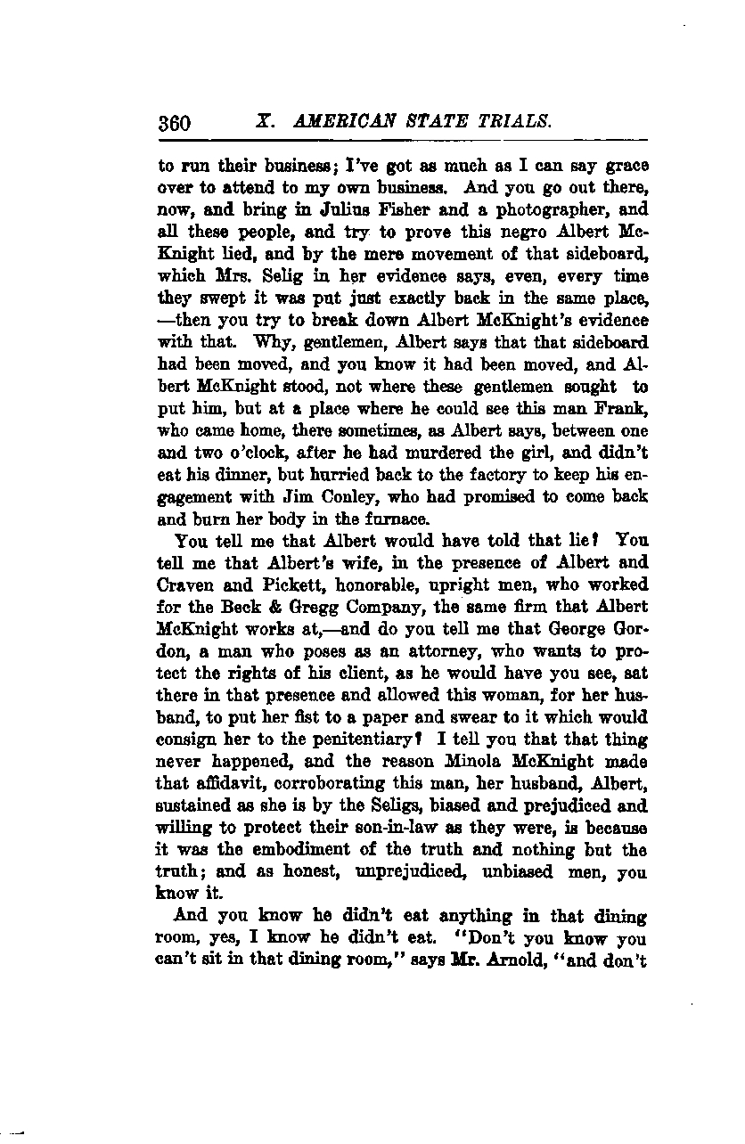 I have enough to attend to my own business without running theirs. Now, go out there and bring in Julius Fisher, a photographer, and all these people to try to prove that the negro Albert McKnight lied. By the mere movement of that sideboard, which Mrs. Selig in her evidence says was put back in the exact same place every time they swept, you try to break down Albert McKnight's evidence. Gentlemen, Albert says that the sideboard had been moved, and you know it had been moved. Albert McKnight stood not where these gentlemen sought to put him, but at a place where he could see this man Frank, who came home sometimes between one and two o'clock, after he had murdered the girl. He didn't eat his dinner but hurried back to the factory to keep his engagement with Jim Conley, who had promised to come back and burn her body in the furnace.