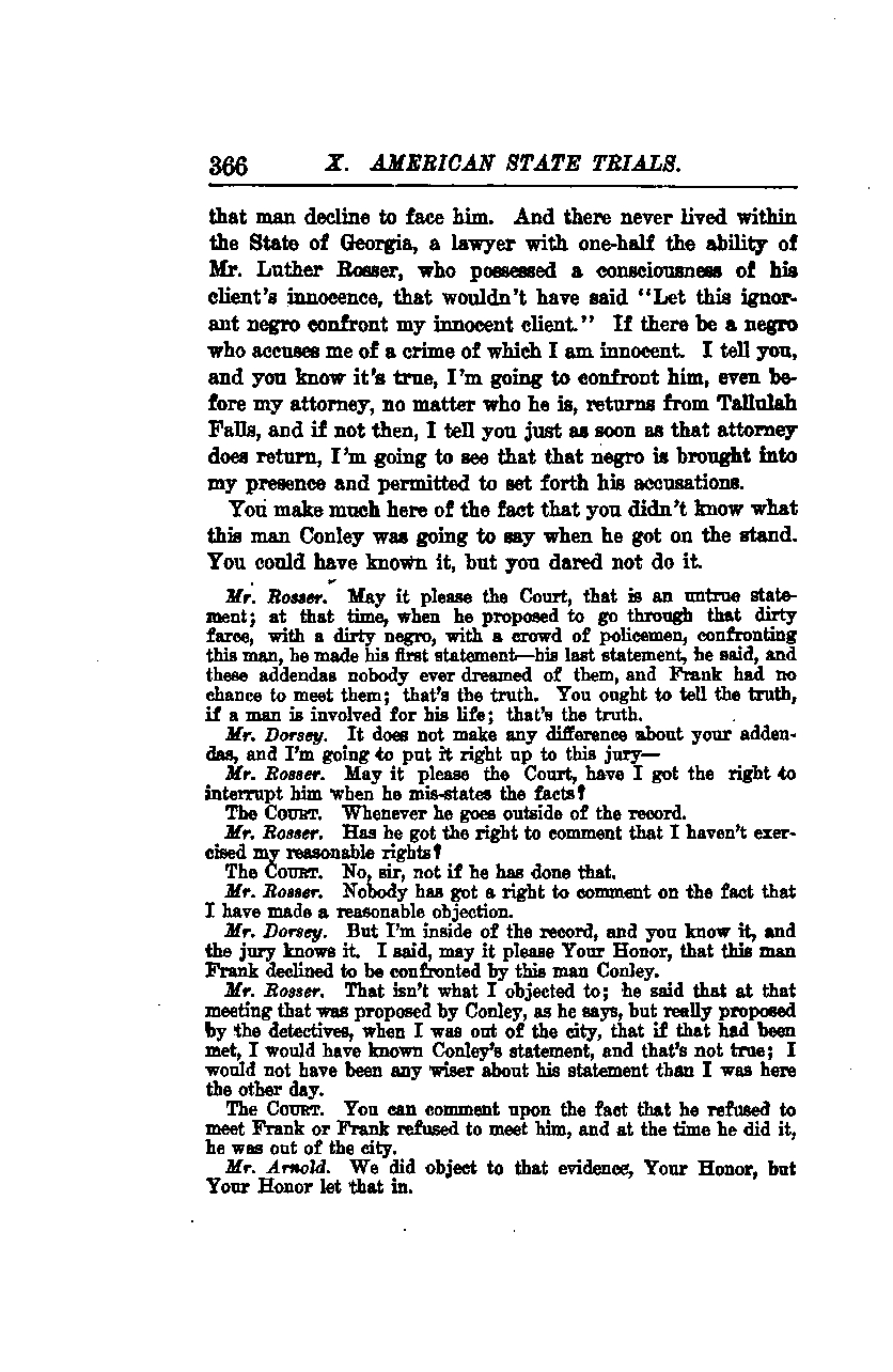There never lived within the State of Georgia a lawyer with half the ability of Mr. Luther Rosser, who, possessing a consciousness of his client's innocence, wouldn't have said, "Let this ignorant negro confront my innocent client." If there be a negro who accuses me of a crime of which I am innocent, I tell you—and you know it's true—I'm going to confront him, even before my attorney, no matter who he is, returns from Tallulah Falls. And if not then, I tell you just as soon as that attorney does return, I'm going to see that that negro is brought into my presence and permitted to set forth his accusations.