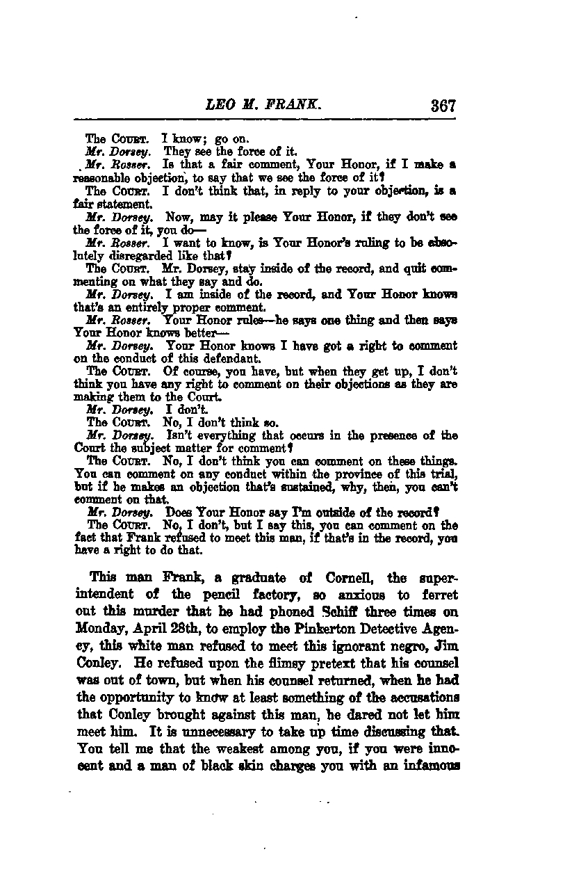 This man Frank, a graduate of Cornell and the superintendent of the pencil factory, was so anxious to ferret out this murder that he had phoned Schiff three times on Monday, April 28th, to employ the Pinkerton Detective Agency. Yet, this white man refused to meet this ignorant negro, Jim Conley. He refused upon the flimsy pretext that his counsel was out of town, but when his counsel returned, when he had the opportunity to know at least something of the accusations that Conley brought against him, he dared not let him meet him. It is unnecessary to take up time discussing that. You tell me that the weakest among you, if you were innocent and a man of black skin charged you with an infamous crime, would refuse to meet him.