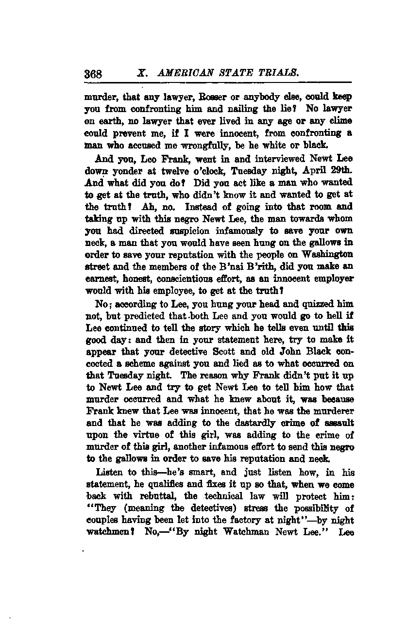 And you, Leo Frank, went in and interviewed Newt Lee down yonder at twelve o'clock, Tuesday night, April 29th. And what did you do? Did you act like a man who wanted to get at the truth, who didn't know it and wanted to get at the truth? Ah, no. Instead of going into that room and taking up with this negro Newt Lee, the man towards whom you had directed suspicion infamously to save your own neck, a man that you would have seen hung on the gallows in order to save your reputation with the people on Washington street and the members of the B'nai B'rith, did you make an earnest, honest, conscientious effort, as an innocent employer would with his employee, to get at the truth?