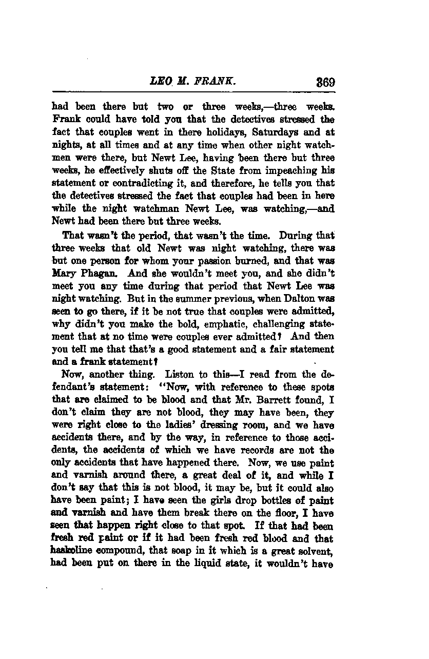 That wasn't the period, nor was it the time. During the three weeks that old Newt was night watching, there was only one person for whom your passion burned, and that was Mary Phagan. She wouldn't meet you, and she didn't meet you at any time during that period when Newt Lee was night watching. However, in the previous summer, when Dalton was seen to go there, if it were not true that couples were admitted, why didn't you make the bold, emphatic, challenging statement that at no time were couples ever admitted? And then you tell me that that's a good statement, a fair statement, and a frank statement?