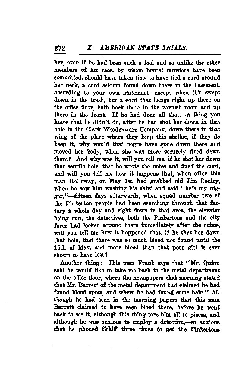 Even if he had been such a fool and so unlike the other members of his race, by whom brutal murders have been committed, he should have taken time to tie a cord around her neck. A cord seldom found down there in the basement, according to your own statement, except when it's swept down in the trash, but a cord that hangs right up there on the office floor, both back there in the varnish room and up there in the front. If he had done all that—a thing you know that he didn't do—after he had shot her down in that hole in the Clark Woodenware Company, down there in that wing of the place where they keep this shellac, if they do keep it, why would that negro have gone down there and moved her body, when she was more securely fixed down there? And why was it, will you tell me, if he shot her down that scuttle hole, that he wrote the notes and fixed the cord? Will you tell me how it happens that, when after this man Holloway, on May 1st, had grabbed old Jim Conley, when he saw him washing his shirt and said, "he's my nigger,"—fifteen days afterwards, when squad number two of the Pinkerton people had been searching through that factory a whole day and right down in that area, the elevator being run, the detectives, both the Pinkertons and the city force had looked around there immediately after the crime, will you tell me how it happened that, if he shot her down that hole, that there was so much blood not found until the 15th of May, and more blood than that poor girl is ever shown to have lost?