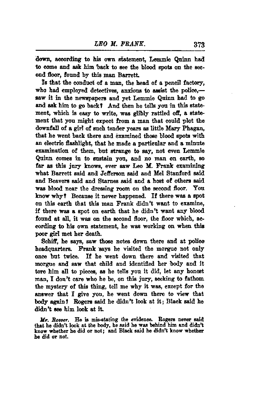 Schiff, he says, saw those notes down there and at police headquarters. Frank says he visited the morgue not only once but twice. If he went down there and visited that morgue and saw that child and identified her body and it tore him all to pieces, as he tells you it did, let any honest man, I don’t care who he be, on this jury, seeking to fathom the mystery of this thing, tell me why it was, except for the answer that I give you, he went down there to view that body again? Rogers said he didn’t look at it; Black said he didn’t see him look at it.