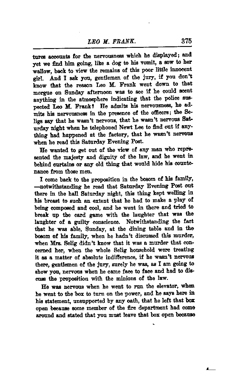 Leo M. Frank's nervousness can be attributed to the circumstances surrounding the case, yet he returned, like a dog to its vomit or a sow to its wallow, to view the remains of this poor, innocent girl. I ask you, gentlemen of the jury, if you don't know that the reason Leo M. Frank went to the morgue on Sunday afternoon was to see if he could detect anything in the atmosphere indicating that the police suspected him? He admits his nervousness, and he admits being nervous in the presence of the officers. The Seligs say that he wasn't nervous on Saturday night when he telephoned Newt Lee to find out if anything had happened at the factory, and that he wasn't nervous when he read the Saturday Evening Post.