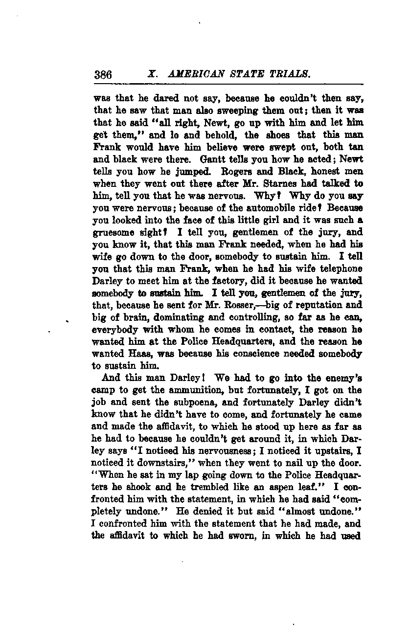 And this man Darley! We had to go into the enemy's camp to get the ammunition, but fortunately, I got on the job and sent the subpoena, and fortunately Darley didn’t know that he didn’t have to come, and fortunately he came and made the affidavit, to which he stood up here as far as he had to because he couldn’t get around it, in which Darley says, "I noticed his nervousness; I noticed it upstairs, I noticed it downstairs," when they went to nail up the door. "When he sat in my lap going down to the Police Headquarters, he shook and he trembled like an aspen leaf." I confronted him with the statement, in which he had said "completely undone." He denied it but said "almost undone." I confronted him with the statement that he had made, and the affidavit to which he had sworn, in which he had used the words "completely undone."