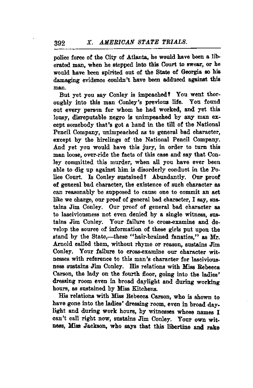 His relations with Miss Rebecca Carson, the lady on the fourth floor, going into the ladies' dressing room even in broad daylight and during working hours, as sustained by Miss Kitchens, sustains Jim Conley. His relations with Miss Rebecca Carson, who is shown to have gone into the ladies' dressing room, even in broad daylight and during work hours, by witnesses whose names I can't call right now, sustains Jim Conley. Your own witness, Miss Jackson, who says that this libertine and rake, sustains Jim Conley.