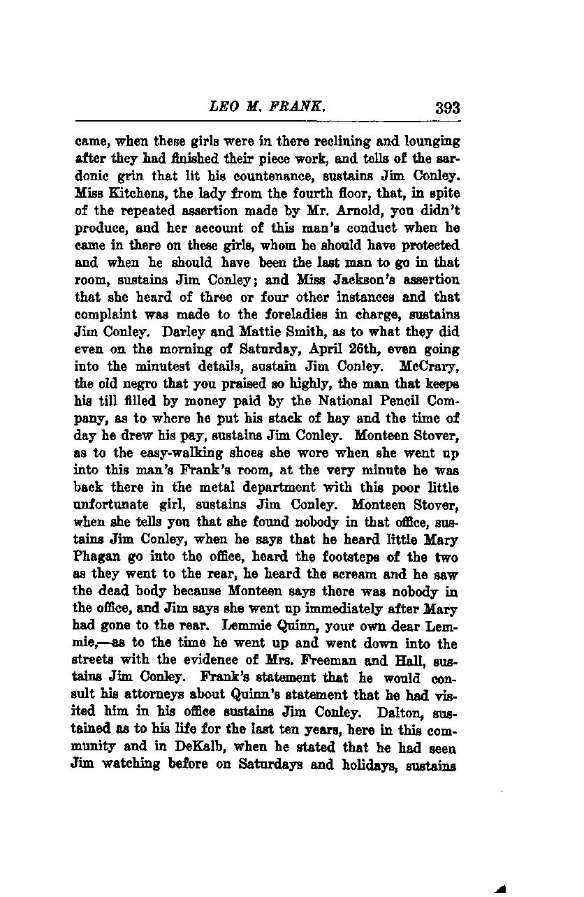 Monteen Stover, as to the easy-walking shoes she wore when she went up into this man's Frank's room, at the very minute he was back there in the metal department with this poor little unfortunate girl, sustains Jim Conley. Monteen Stover, when she tells you that she found nobody in that office, sustains Jim Conley when he says that he heard little Mary Phagan go into the office, heard the footsteps of the two as they went to the rear, he heard the scream, and he saw the dead body because Monteen says there was nobody in the office, and Jim says she went up immediately after Mary had gone to the rear.