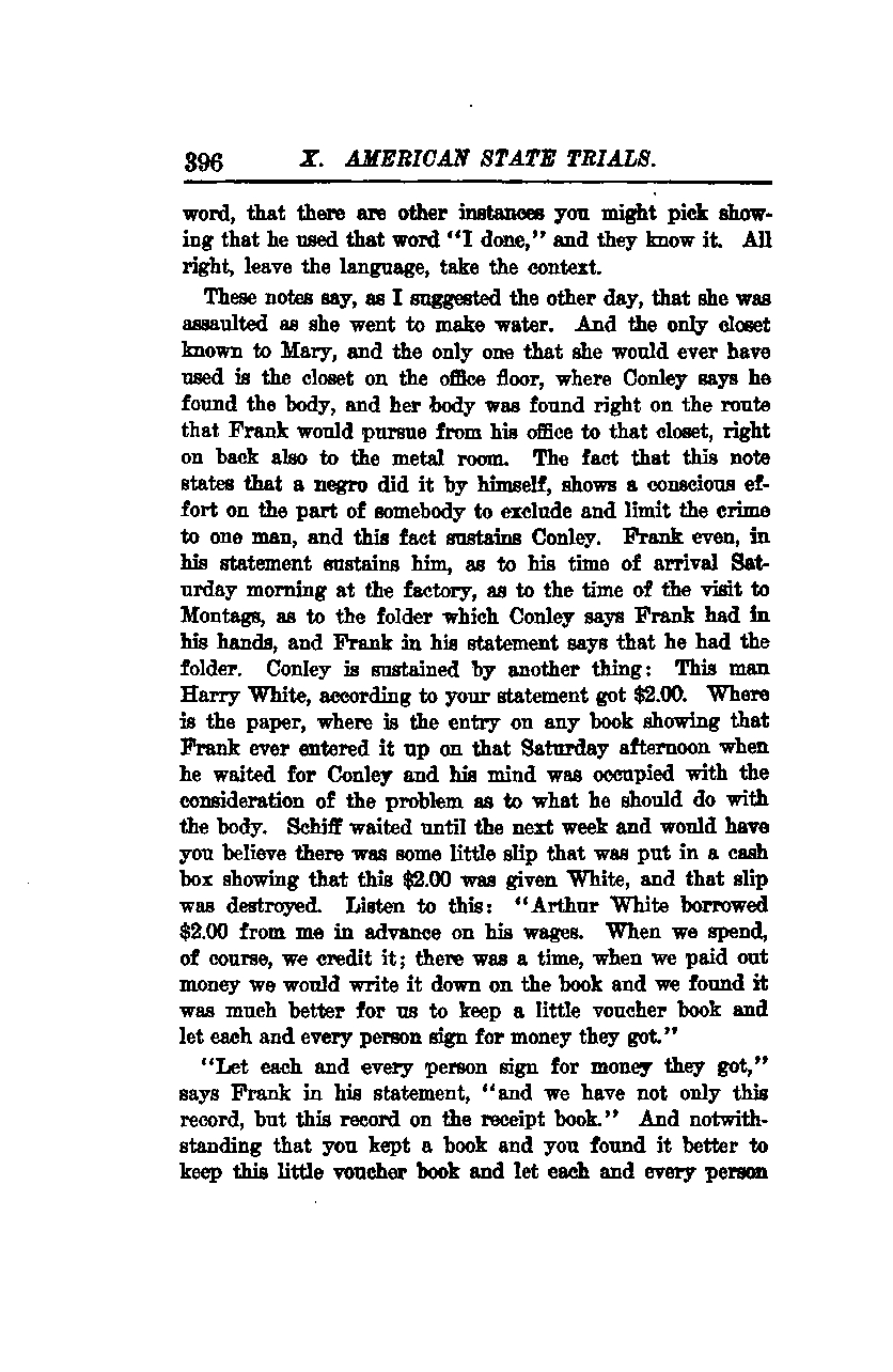 These notes say, as I suggested the other day, that she was assaulted as she went to make water. The only closet known to Mary, and the only one that she would ever have used, is the closet on the office floor, where Conley says he found the body. Her body was found right on the route that Frank would pursue from his office to that closet, and right on back also to the metal room. The fact that this note states that a negro did it by himself shows a conscious effort on the part of somebody to exclude and limit the crime to one man, and this fact sustains Conley. Frank even, in his statement, sustains him as to his time of arrival Saturday morning at the factory, as to the time of the visit to Montags, as to the folder which Conley says Frank had in his hands, and Frank in his statement says that he had the folder. Conley is sustained by another thing: This man Harry White, according to your statement, got $2.00. Where is the paper, where is the entry on any book showing that Frank ever entered it up on that Saturday afternoon when he waited for Conley and his mind was occupied with the consideration of the problem as to what he should do with the body? Schiff waited until the next week and would have you believe there was some little slip that was put in a cash box showing that this $2.00 was given to White, and that slip was destroyed. Listen to this: "Arthur White borrowed $2.00 from me in advance on his wages. When we spend, of course, we credit it; there was a time when we paid out money we would write it down on the book, and we found it was much better for us to keep a little voucher book and let each and every person sign for money they got."
