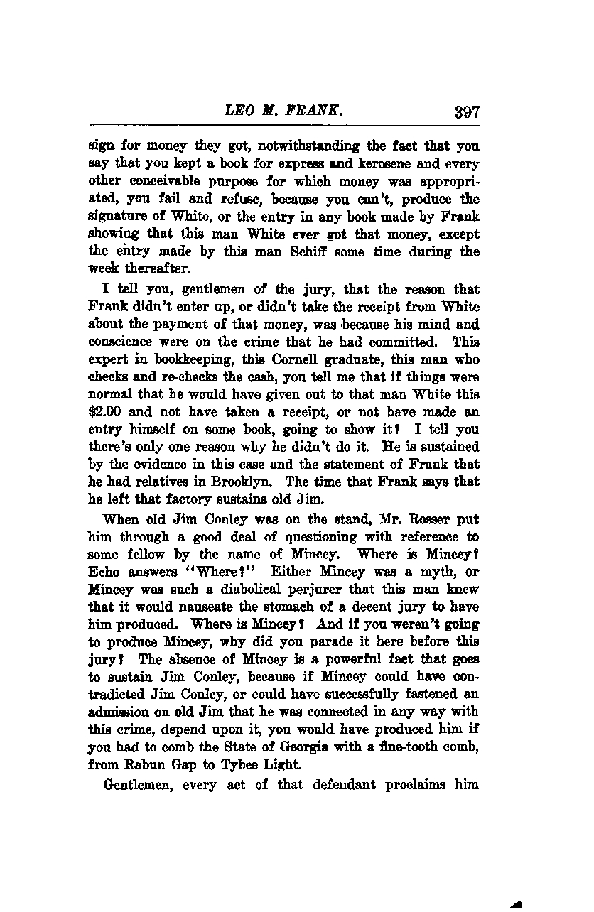 I tell you, gentlemen of the jury, that the reason Frank didn't enter up, or didn't take the receipt from White about the payment of that money, was because his mind and conscience were on the crime that he had committed. This expert in bookkeeping, the Cornell graduate, this man who checks and re-checks the cash, you tell me that if things were normal, he would have given out to that man White this $2.00 and not have taken a receipt, or not have made an entry himself on some book, going to show it! I tell you there's only one reason why he didn't do it. He is sustained by the evidence in this case and the statement of Frank that he had relatives in Brooklyn. The time that Frank says that he left that factory sustains old Jim.