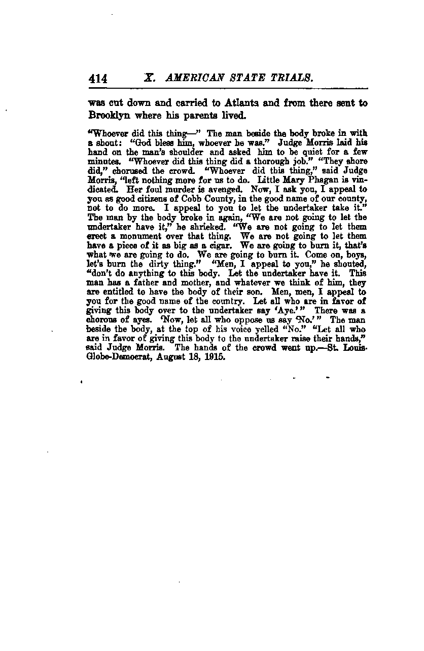 "Whoever did this thing—" The man beside the body broke in with a shout: "God bless him, whoever he was." Judge Morris laid his hand on the man's shoulder and asked him to be quiet for a few minutes. "Whoever did this thing did a thorough job." "They sure did," chorused the crowd. "Whoever did this thing," said Judge Morris, "left nothing more for us to do. Little Mary Phagan is vindicated. Her foul murder is avenged. Now, I ask you, I appeal to you as good citizens of Cobb County, in the good name of our county, not to do more. I appeal to you to let the undertaker take it."