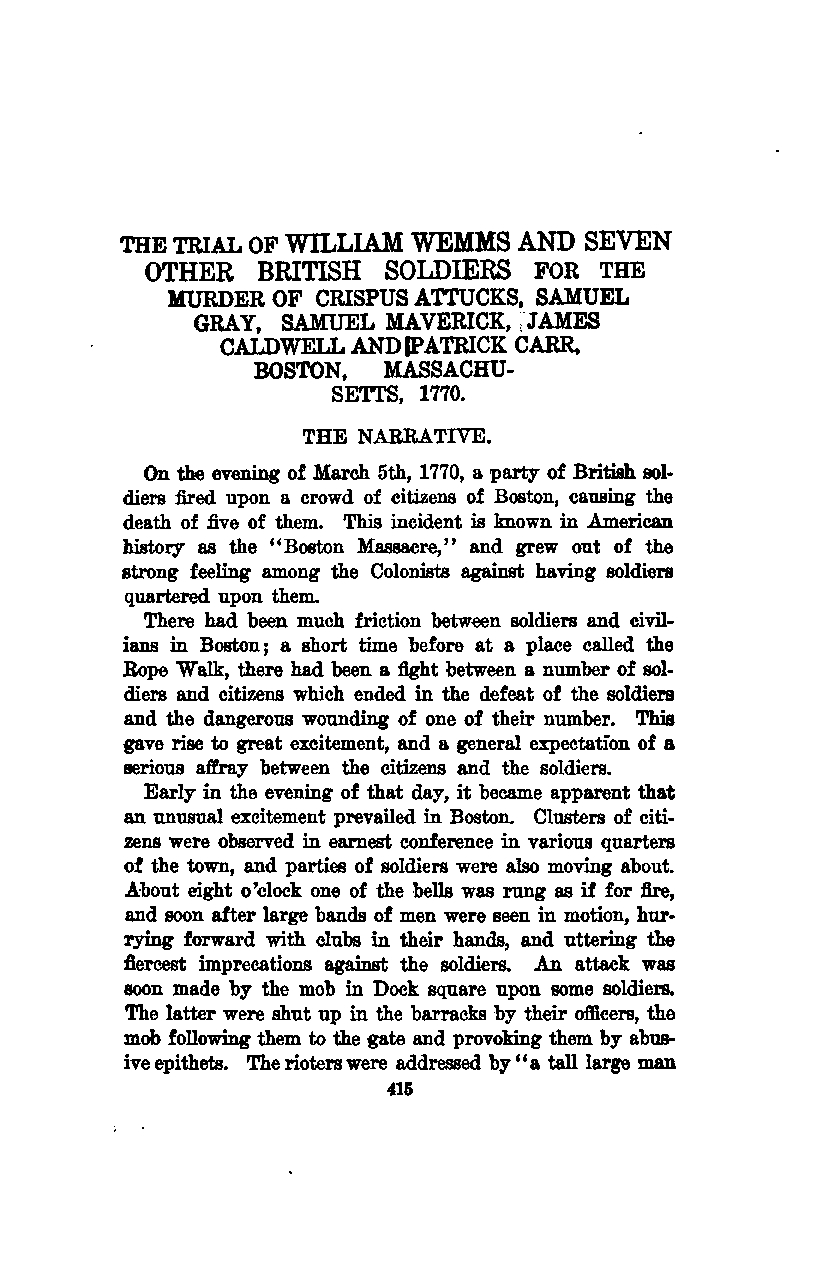 THE TRIAL OF WILLIAM WEMMS AND SEVEN OTHER BRITISH SOLDIERS FOR THE MURDER OF CRISPUS ATTUCKS, SAMUEL GRAY, SAMUEL MAVERICK, JAMES CALDWELL, AND PATRICK CARR, BOSTON, MASSACHUSETTS, 1770.
