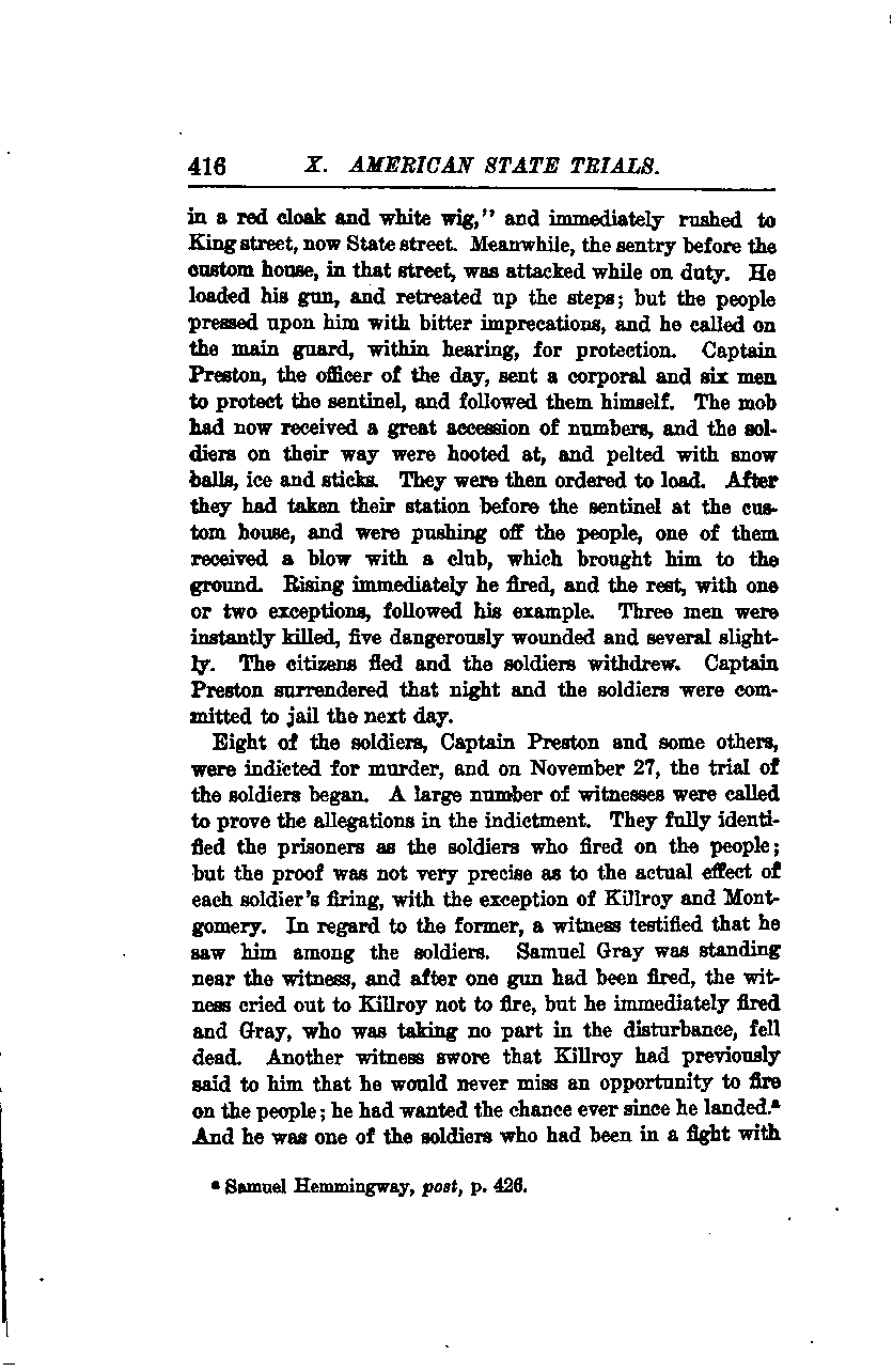Eight of the soldiers, Captain Preston, and some others were indicted for murder. On November 27, the trial of the soldiers began. A large number of witnesses were called to prove the allegations in the indictment. They fully identified the prisoners as the soldiers who fired on the people, but the proof was not very precise as to the actual effect of each soldier's firing, with the exception of Killroy and Montgomery. In regard to the former, a witness testified that he saw him among the soldiers. Samuel Gray was standing near the witness, and after one gun had been fired, the witness cried out to Killroy not to fire, but he immediately fired, and Gray, who was taking no part in the disturbance, fell dead. Another witness swore that Killroy had previously said to him that he would never miss an opportunity to fire on the people; he had wanted the chance ever since he landed. And he was one of the soldiers who had been in a fight with Samuel Hemmingway.