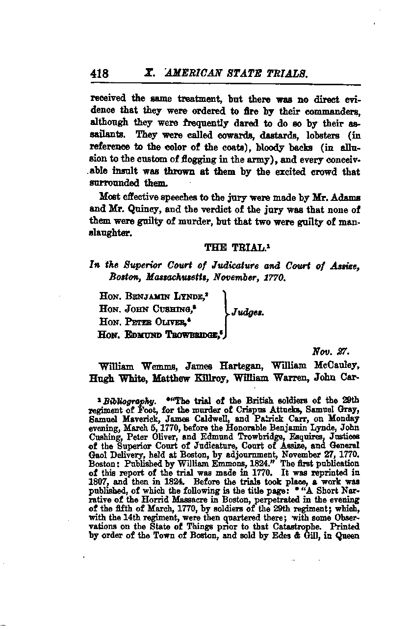 *“The Trial of the British Soldiers of the 29th Regiment of Foot, for the Murder of Crispus Attucks, Samuel Gray, Samuel Maverick, James Caldwell, and Patrick Carr, on Monday Evening, March 5, 1770, before the Honorable Benjamin Lynde, John Cushing, Peter Oliver, and Edmund Trowbridge, Esquires, Justices of the Superior Court of Judicature, Court of Assize, and General Gaol Delivery, held at Boston, by adjournment, November 27, 1770. Boston: Published by William Emmons, 1824.”* The first publication of this report of the trial was made in 1770. It was reprinted in 1807, and then in 1824. Before the trials took place, a work was published, of which the following is the title page: *“A Short Narrative of the Horrid Massacre in Boston, Perpetrated in the Evening of the Fifth of March, 1770, by Soldiers of the 29th Regiment; Which, with the 14th Regiment, Were Then Quartered There; With Some Observations on the State of Things Prior to That Catastrophe. Printed by Order of the Town of Boston, and Sold by Edes & Gill, in Queen Street.”*