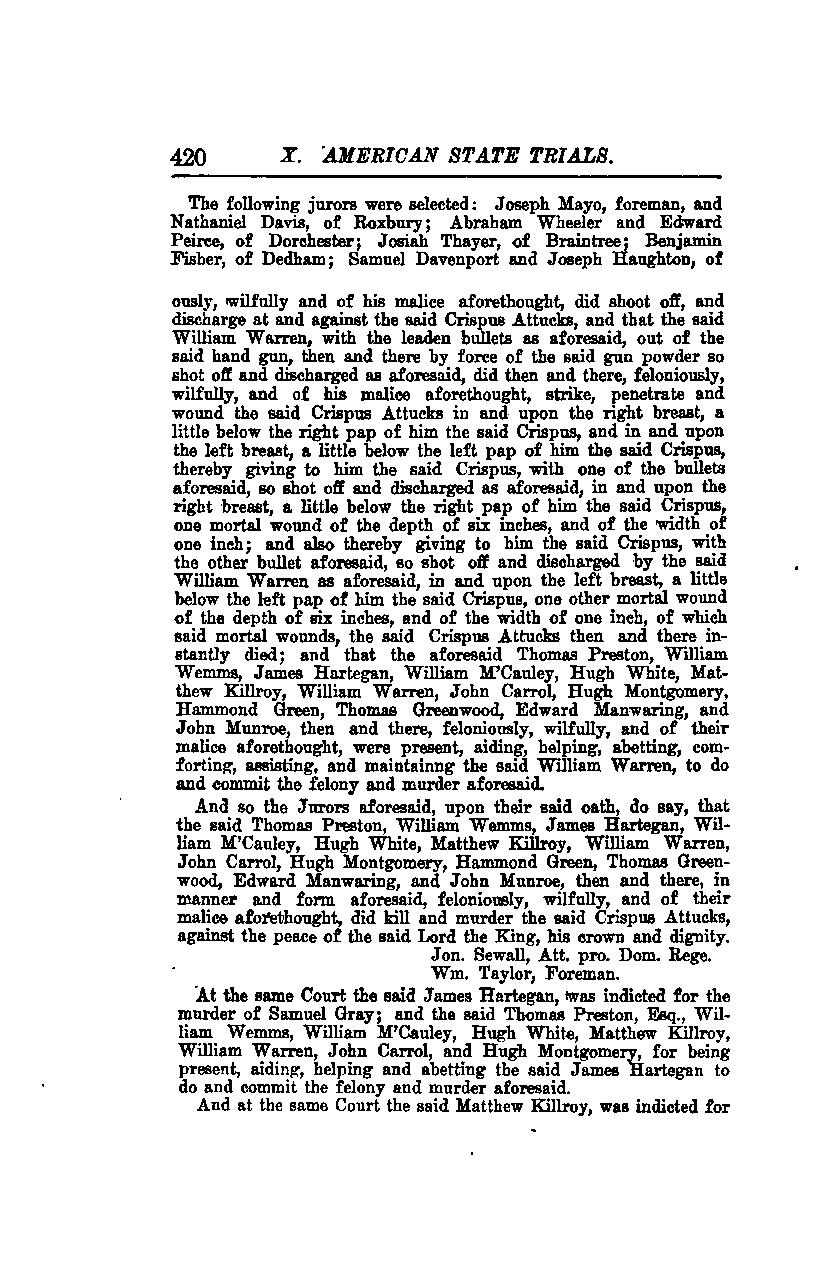 And so the Jurors aforesaid, upon their said oath, do say, that the said Thomas Preston, William Wemms, James Hartegan, William M’Cauley, Hugh White, Matthew Kilroy, William Warren, John Carrol, Hugh Montgomery, Hammond Green, Thomas Greenwood, Edward Manwaring, and John Munroe, then and there, in manner and form aforesaid, feloniously, wilfully, and of their malice aforethought, did kill and murder the said Crispus Attucks, against the peace of the said Lord the King, his crown and dignity.