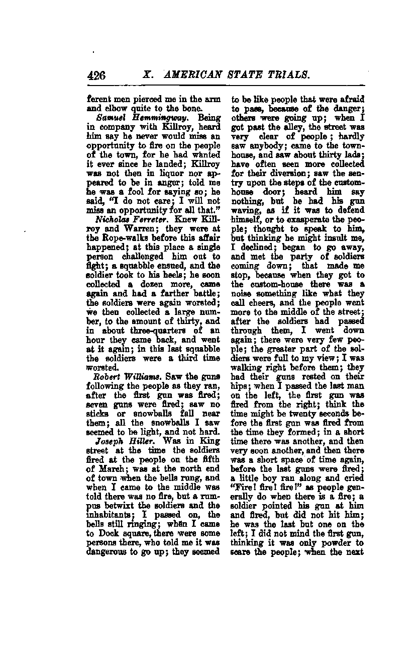 **Joseph Hilter.** I was in King Street at the time the soldiers fired at the people on the fifth of March. I was at the north end of town when the bells rang, and when I came to the middle, I was told there was no fire, but a ruckus between the soldiers and the inhabitants. I passed on, the bells still ringing. When I came to Dock Square, there were some people there who told me it was dangerous to go up; they seemed to be like people that were afraid to pass because of the danger. Others were going up. When I got past the alley, the street was very clear of people; I hardly saw anybody. I came to the townhouse and saw about thirty lads; I have often seen more collected for their diversion. I saw the sentry upon the steps of the customhouse door; I heard him say nothing, but he had his gun waving, as if it was to defend himself or to exasperate the people. I thought to speak to him, but thinking he might insult me, I declined. I began to go away and met the party of soldiers coming down; that made me stop because when they got to the customhouse, there was a noise something like what they call cheers, and the people went more to the middle of the street. After the soldiers had passed through them, I went down again; there were very few people. The greater part of the soldiers were full to my view; I was walking right before them. They had their guns rested on their hips. When I passed the last man on the left, the first gun was fired from the right; I think the time might be twenty seconds before the first gun was fired from the time they formed. In a short time, there was another, and then very soon another, and then there was a short space of time again before the last guns were fired. A little boy ran along and cried "Fire! fire! fire!" as people generally do when there is a fire. A soldier pointed his gun at him and fired, but did not hit him; he was the last but one on the left. I did not mind the first gun, thinking it was only powder to scare the people; when the next gun was fired, I thought it was the same.