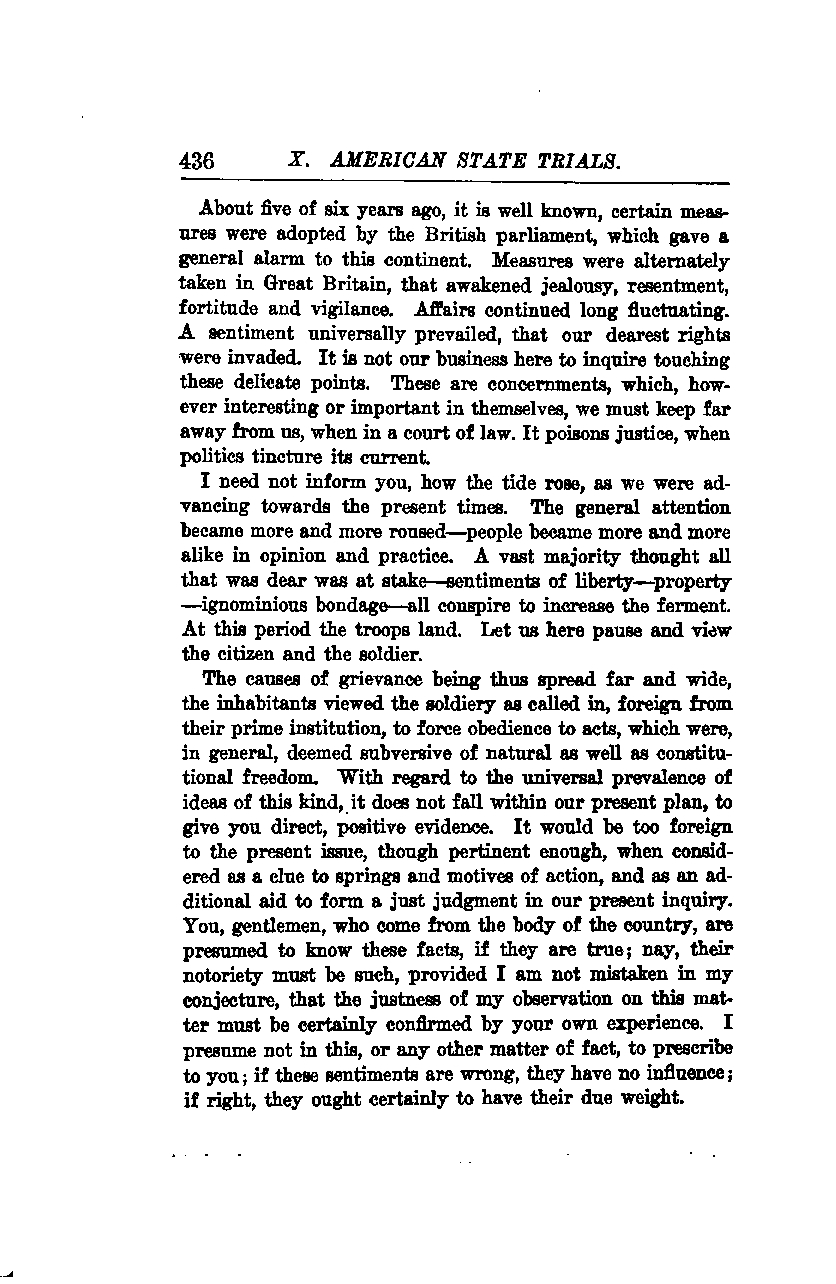 About five or six years ago, it is well known, certain measures were adopted by the British parliament, which gave a general alarm to this continent. Measures were alternately taken in Great Britain that awakened jealousy, resentment, fortitude, and vigilance. Affairs continued long fluctuating. A sentiment universally prevailed that our dearest rights were invaded. It is not our business here to inquire touching these delicate points. These are concernments, which, however interesting or important in themselves, we must keep far away from us when in a court of law. It poisons justice when politics tincture its current.