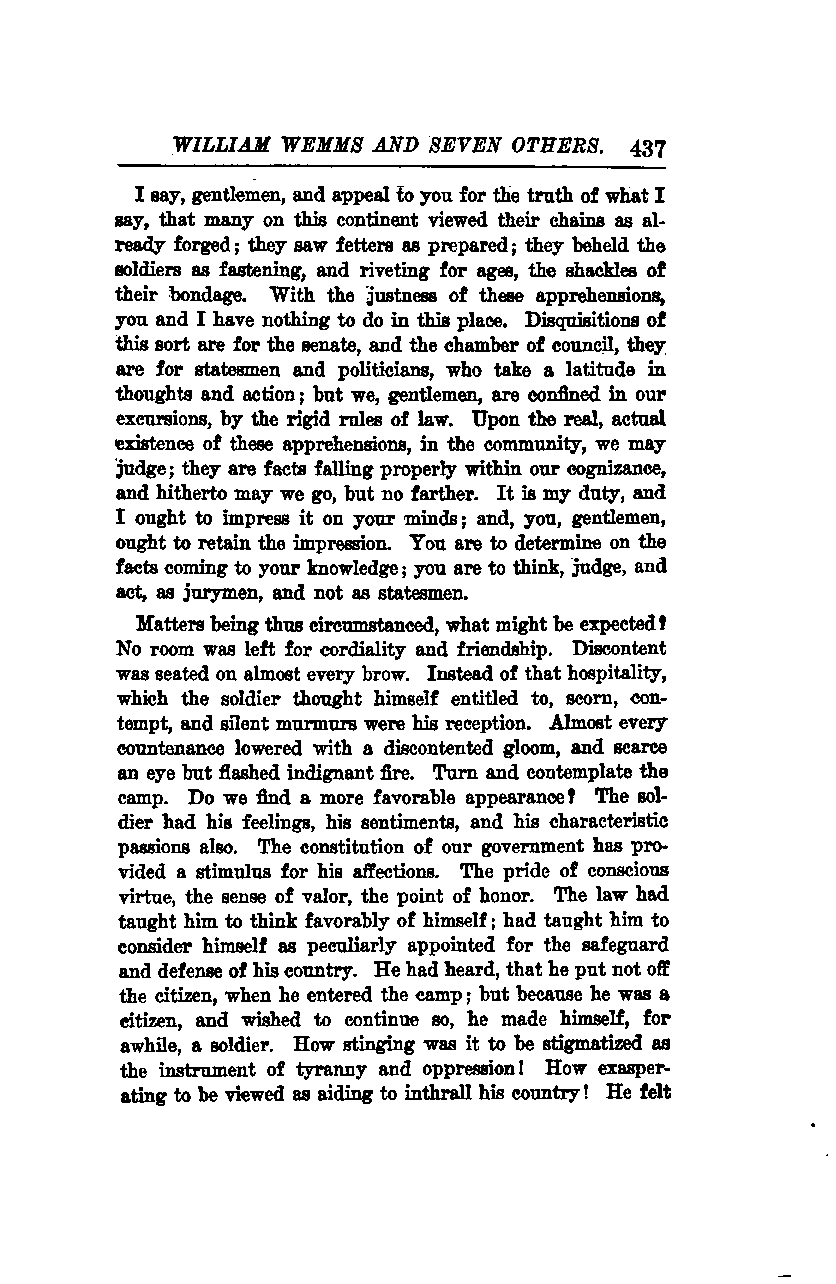Today, gentlemen, I appeal to you for the truth of what I say: many on this continent viewed their chains as already forged. They saw fetters as prepared; they beheld the soldiers as fastening and riveting, for ages, the shackles of their bondage. With the justness of these apprehensions, you and I have nothing to do in this place. Disquisitions of this sort are for the senate and the chamber of council; they are for statesmen and politicians, who take a latitude in thoughts and action. But we, gentlemen, are confined in our excursions by the rigid rules of law. Upon the real, actual existence of these apprehensions in the community, we may judge; they are facts falling properly within our cognizance, and thus far may we go, but no farther. It is my duty, and I ought to impress it on your minds; and you, gentlemen, ought to retain the impression. You are to determine on the facts coming to your knowledge; you are to think, judge, and act as jurymen, and not as statesmen.