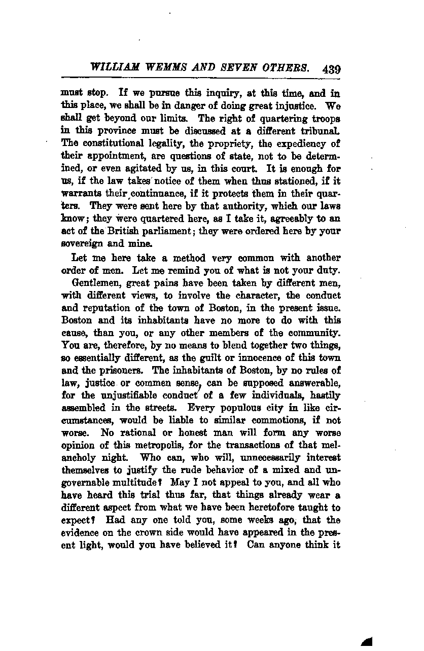 We must stop. If we pursue this inquiry at this time and in this place, we shall be in danger of doing great injustice. We shall get beyond our limits. The right of quartering troops in this province must be discussed at a different tribunal. The constitutional legality, the propriety, the expediency of their appointment are questions of state, not to be determined or even agitated by us in this court. It is enough for us if the law takes notice of them when thus stationed, if it warrants their continuance, if it protects them in their quarters. They were sent here by that authority which our laws know; they were quartered here, as I take it, agreeably to an act of the British Parliament; they were ordered here by your sovereign and mine.